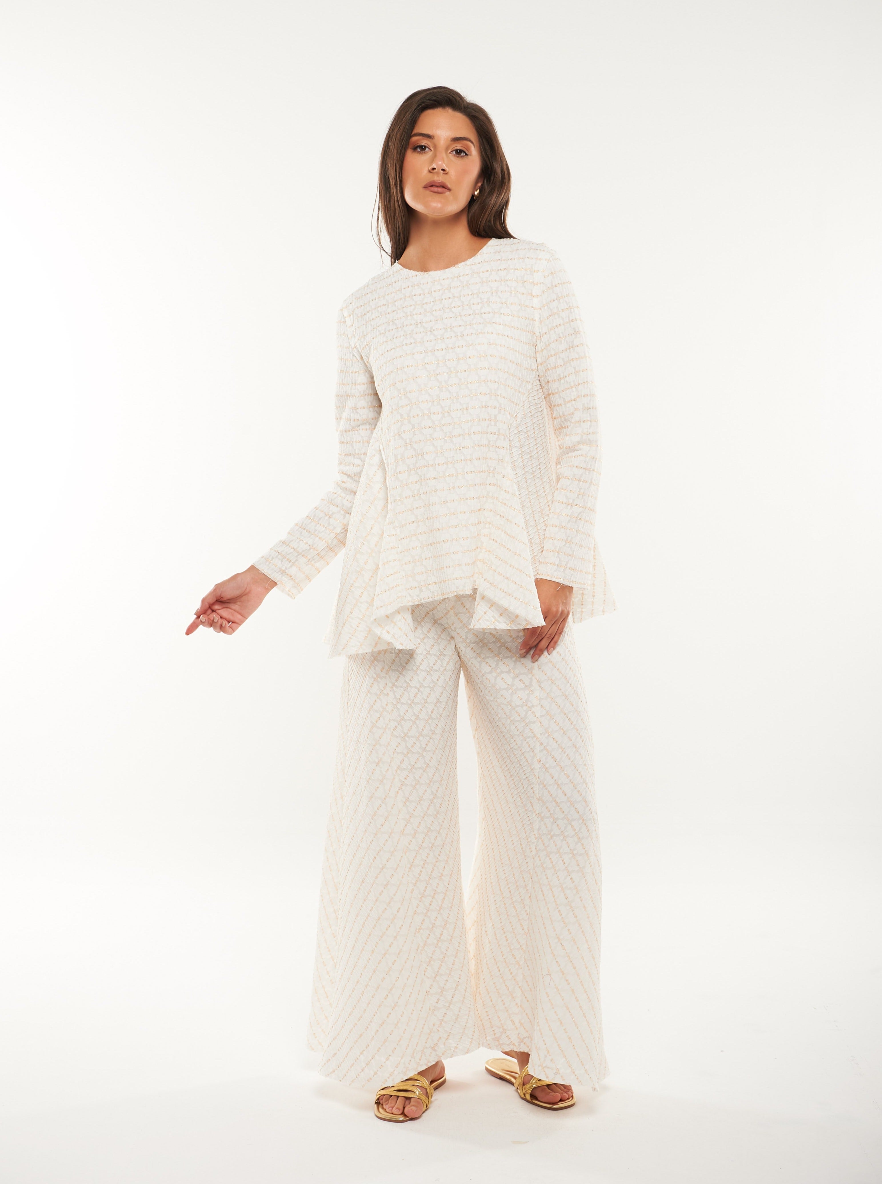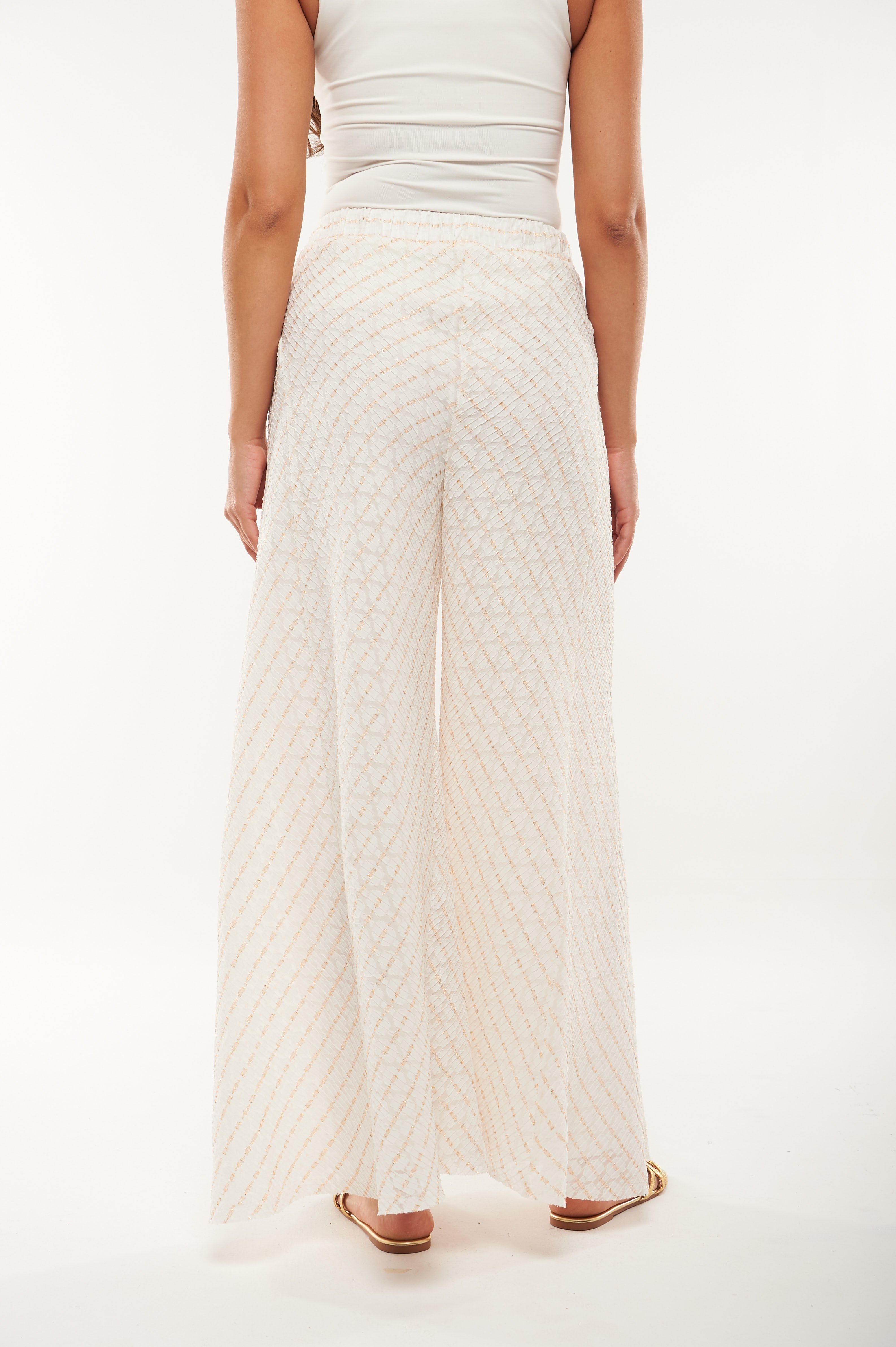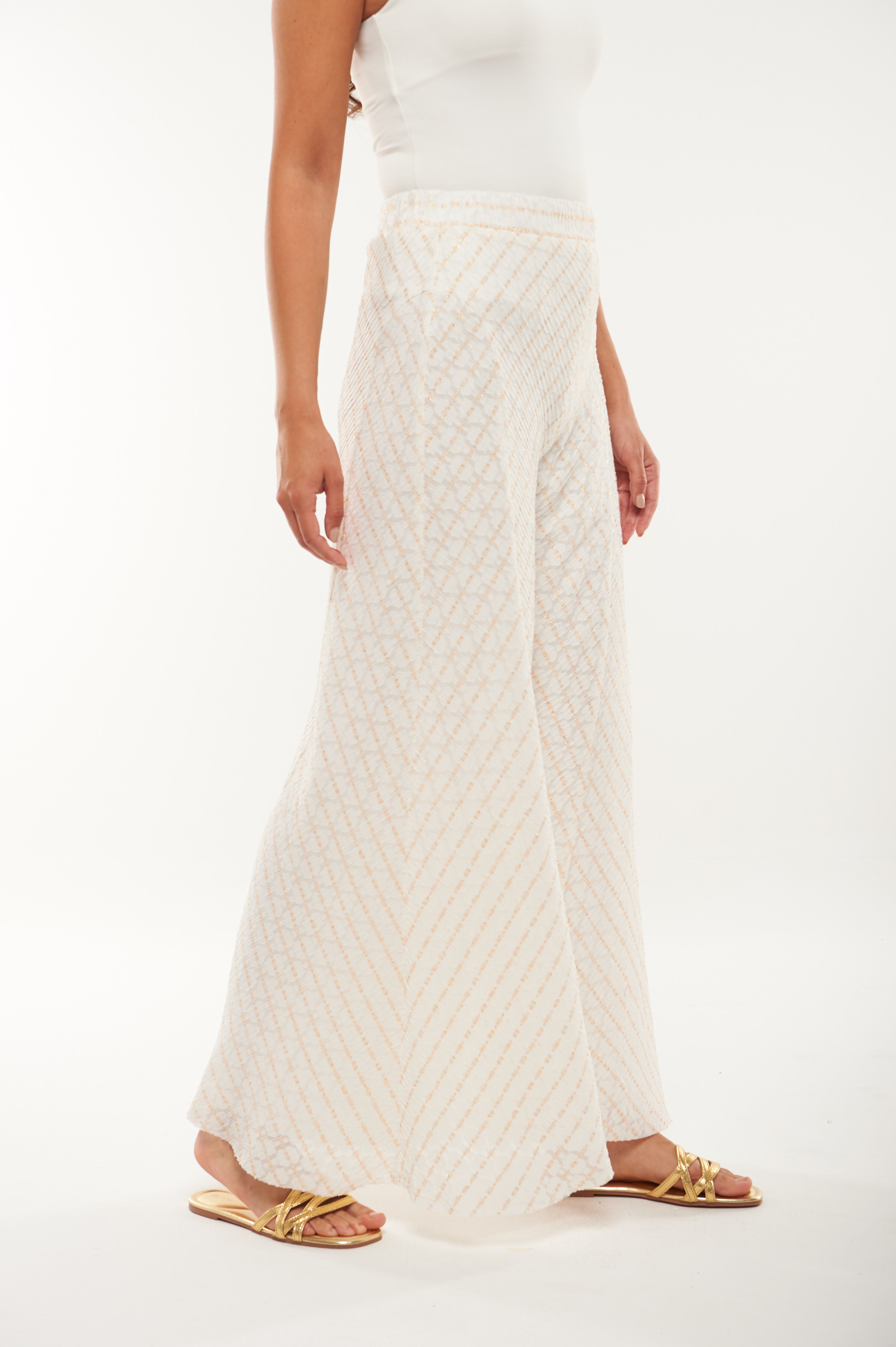 Effortlessly elegant and lightweight, these textured wide-leg pants are designed for relaxed sophistication. Featuring a soft shimmer with a diagonal grid pattern, the fluid silhouette enhances movement while the elastic waistband ensures day-long comfort. Ideal for chic daytime looks or resort evenings.