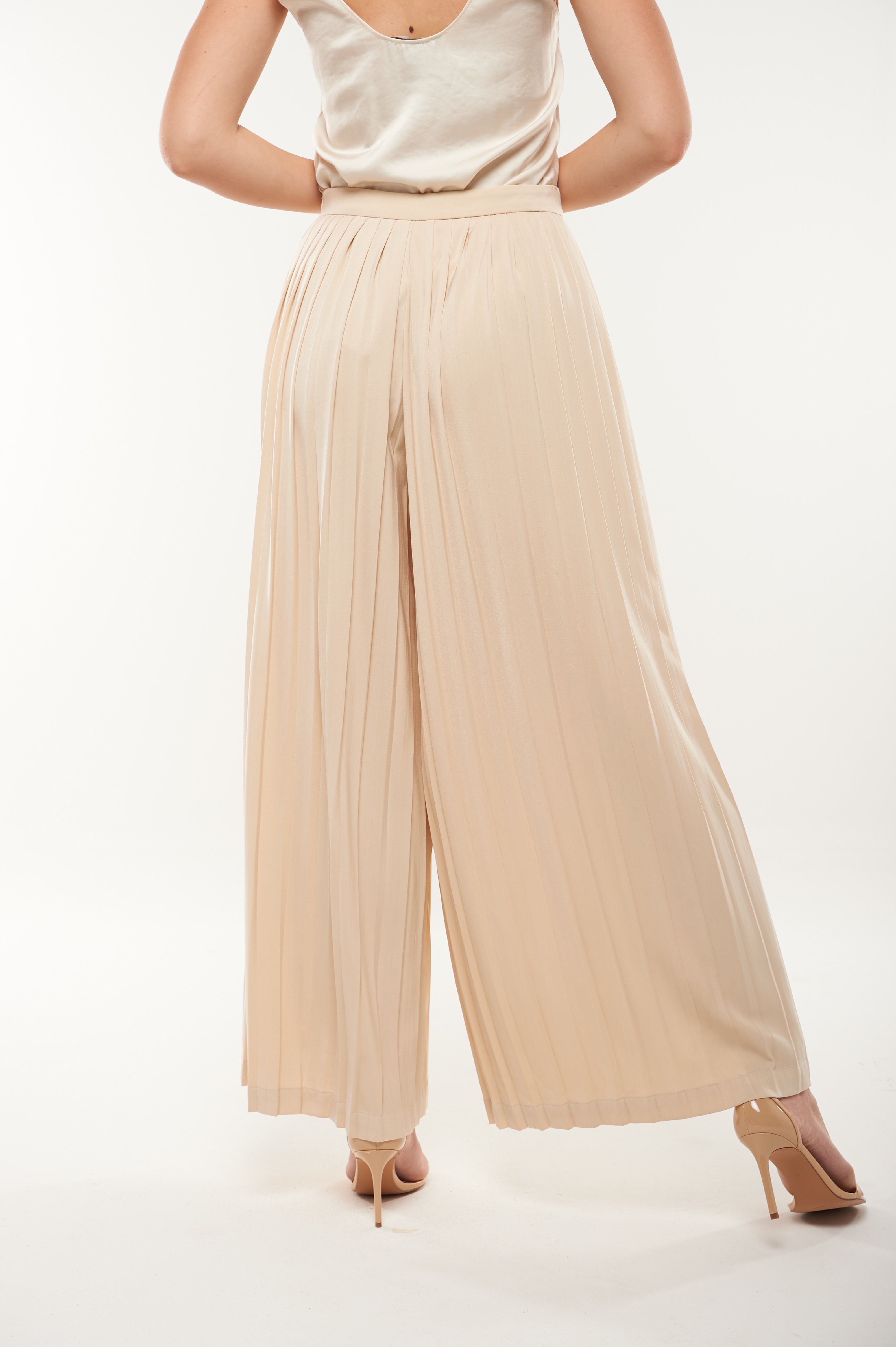Elevate your wardrobe with these elegant pleated wide-leg pants designed for both comfort and refined style. Featuring a high-rise waist and graceful all-over pleats, this flowing silhouette creates effortless movement with every step. The lightweight chiffon-effect fabric offers a soft drape, making it ideal for both casual and semi-formal settings. Fully lined for added comfort, these pants combine timeless femininity with everyday versatility.