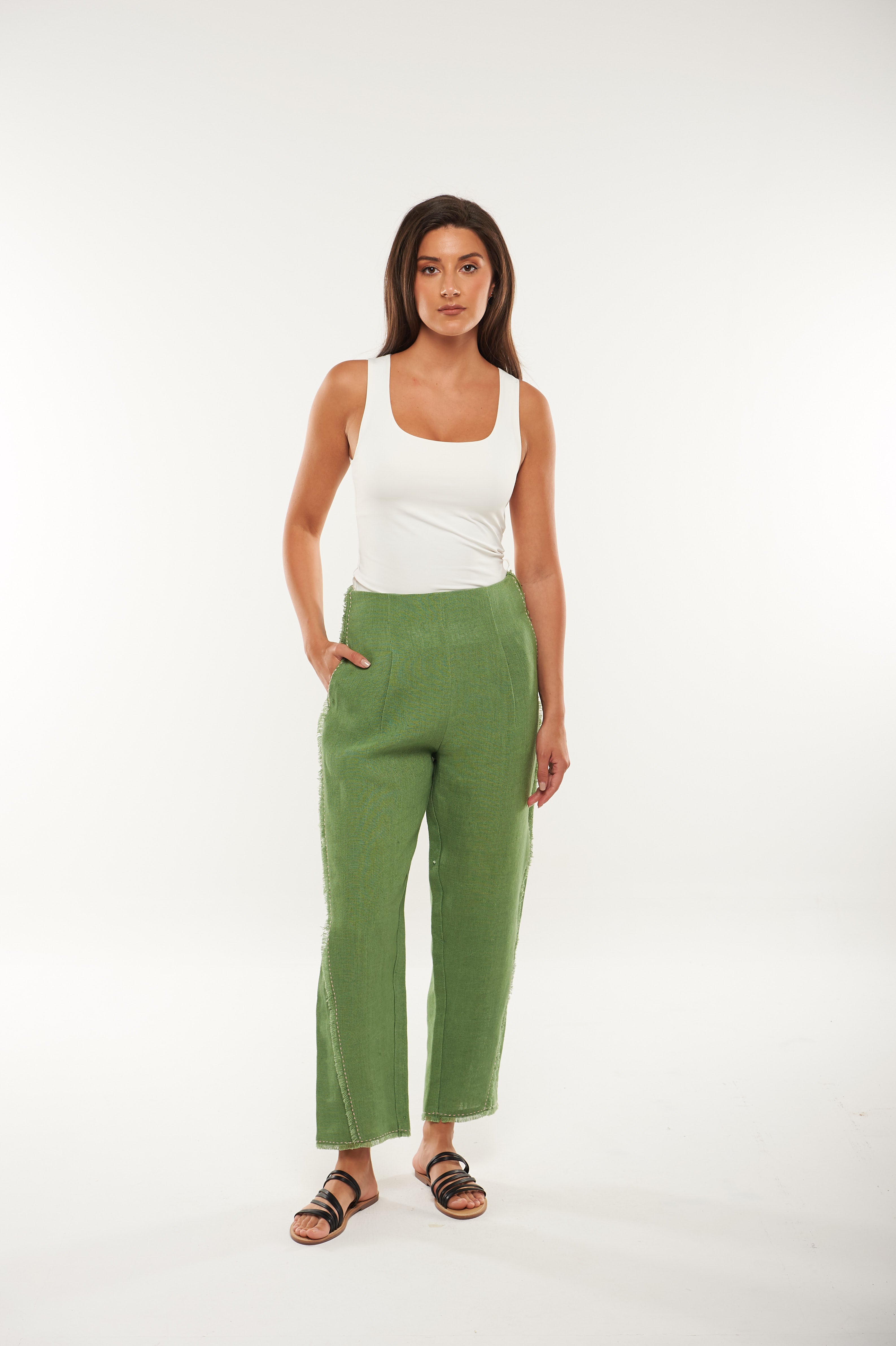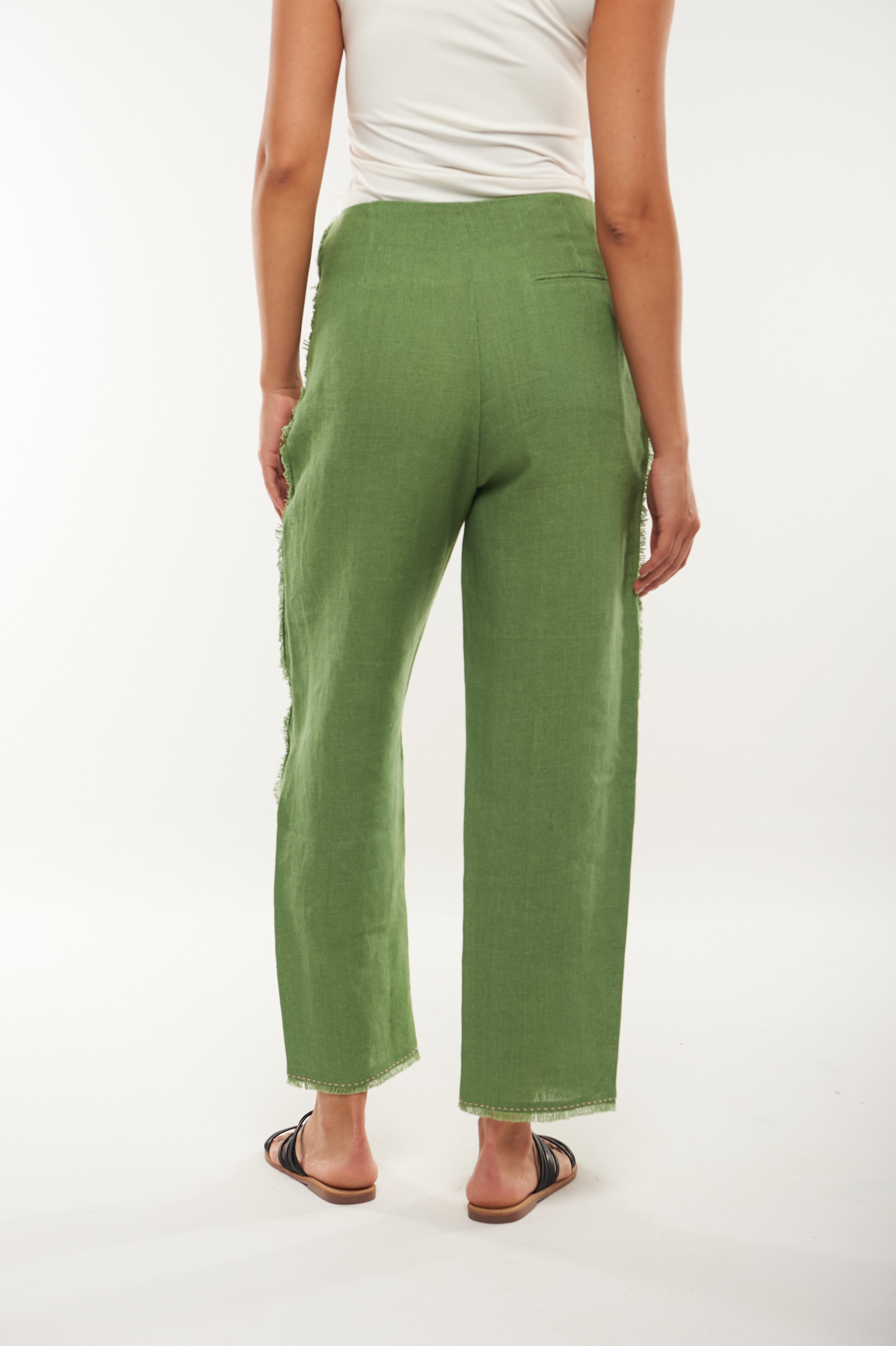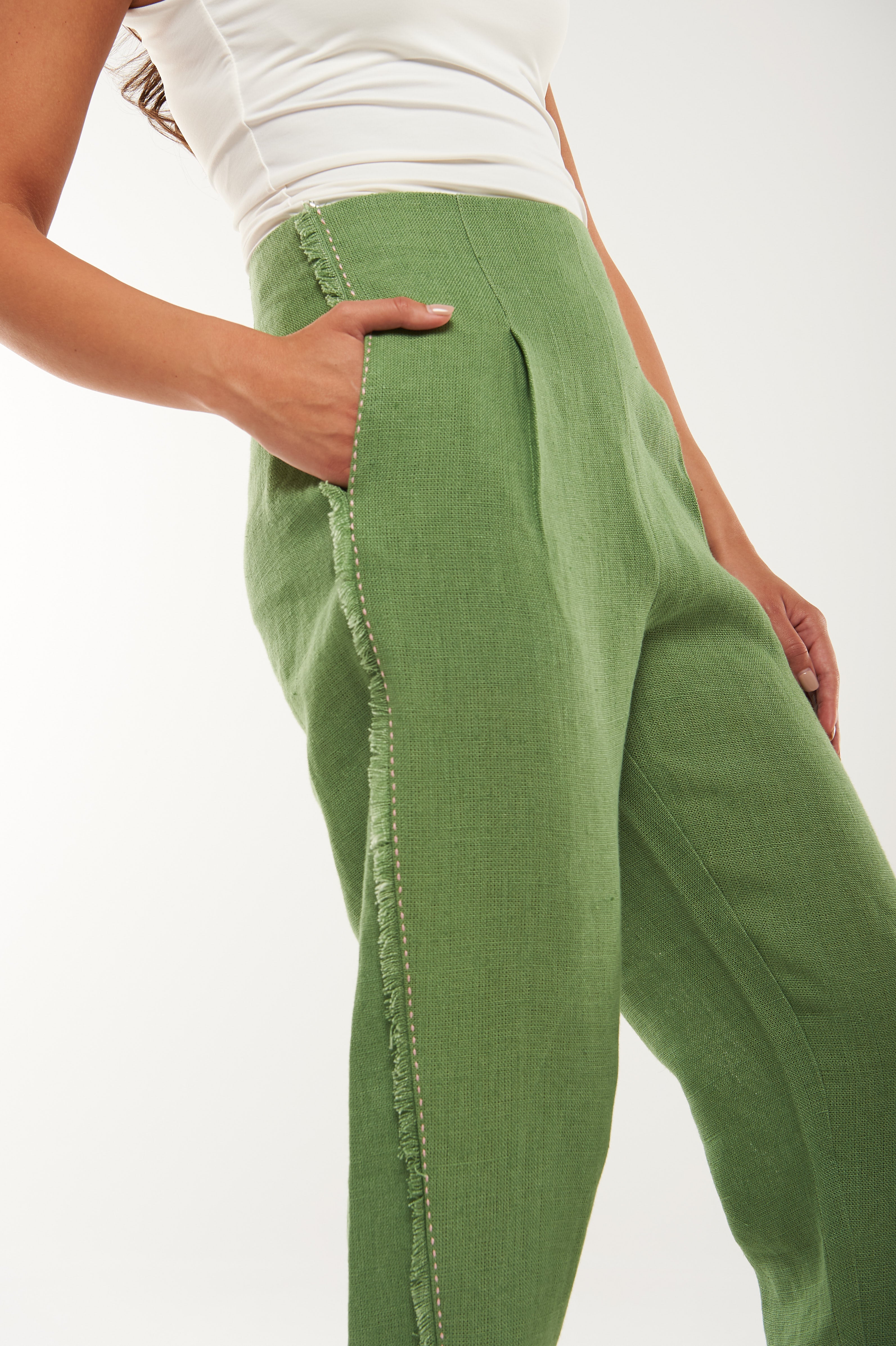 Part of our exclusive Eid & Ramadan collection, these high-waist straight-leg pants are crafted from a breathable linen blend for effortless elegance. Featuring delicate side stitch detailing and subtle frayed edges, they combine comfort with refined style. Designed with side pockets for practicality, they are perfect for both festive gatherings and everyday wear.