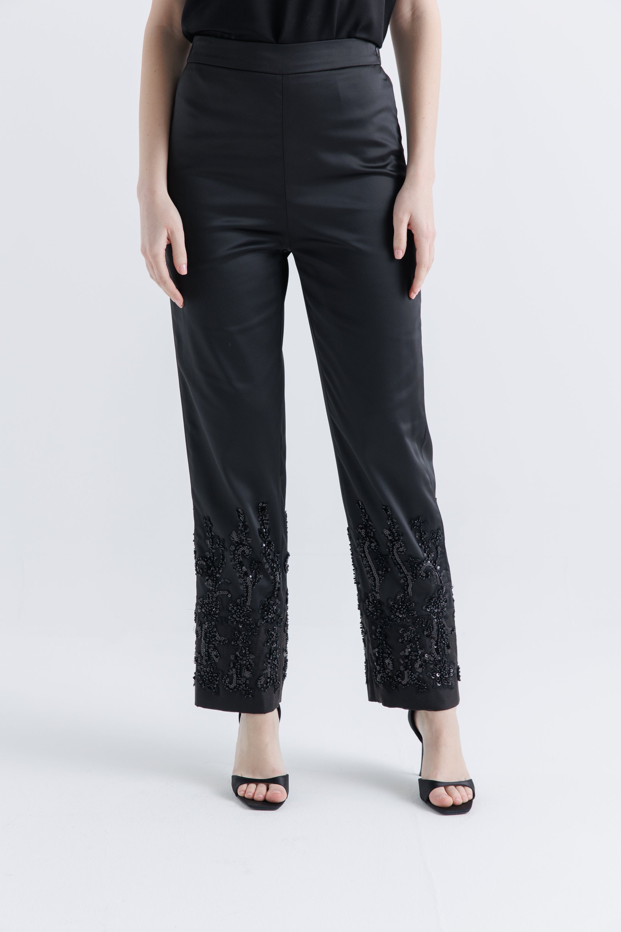 Step into refined luxury with these exquisitely designed tapered pants, perfect for Eid and special occasions. Crafted with premium fabric, the pants feature delicate hand-embellished floral motifs along the hemline, adding a sophisticated sparkle to your look. The sleek, high-waisted silhouette offers both elegance and comfort, making it an ideal choice for modern Arabic fashion.