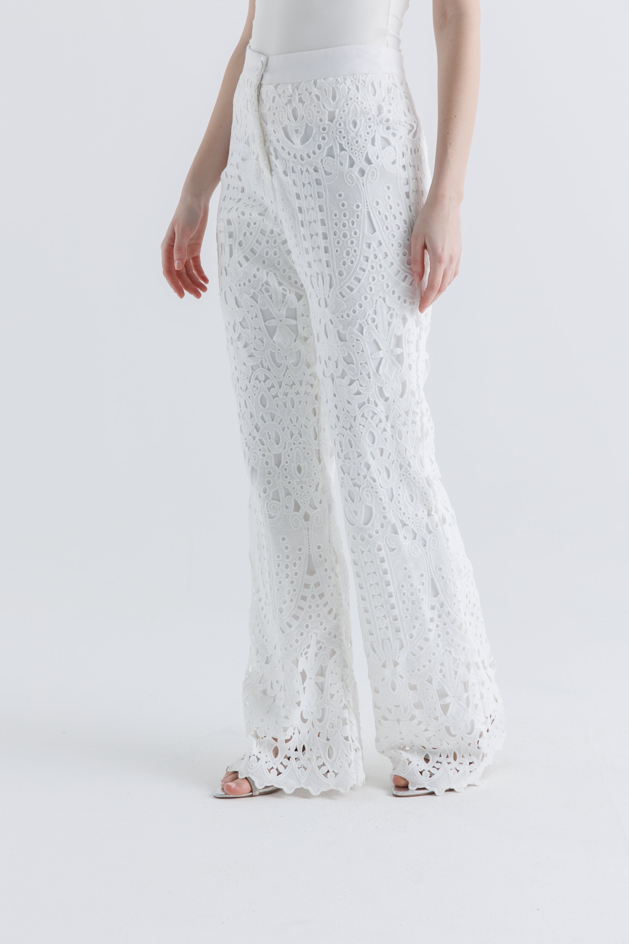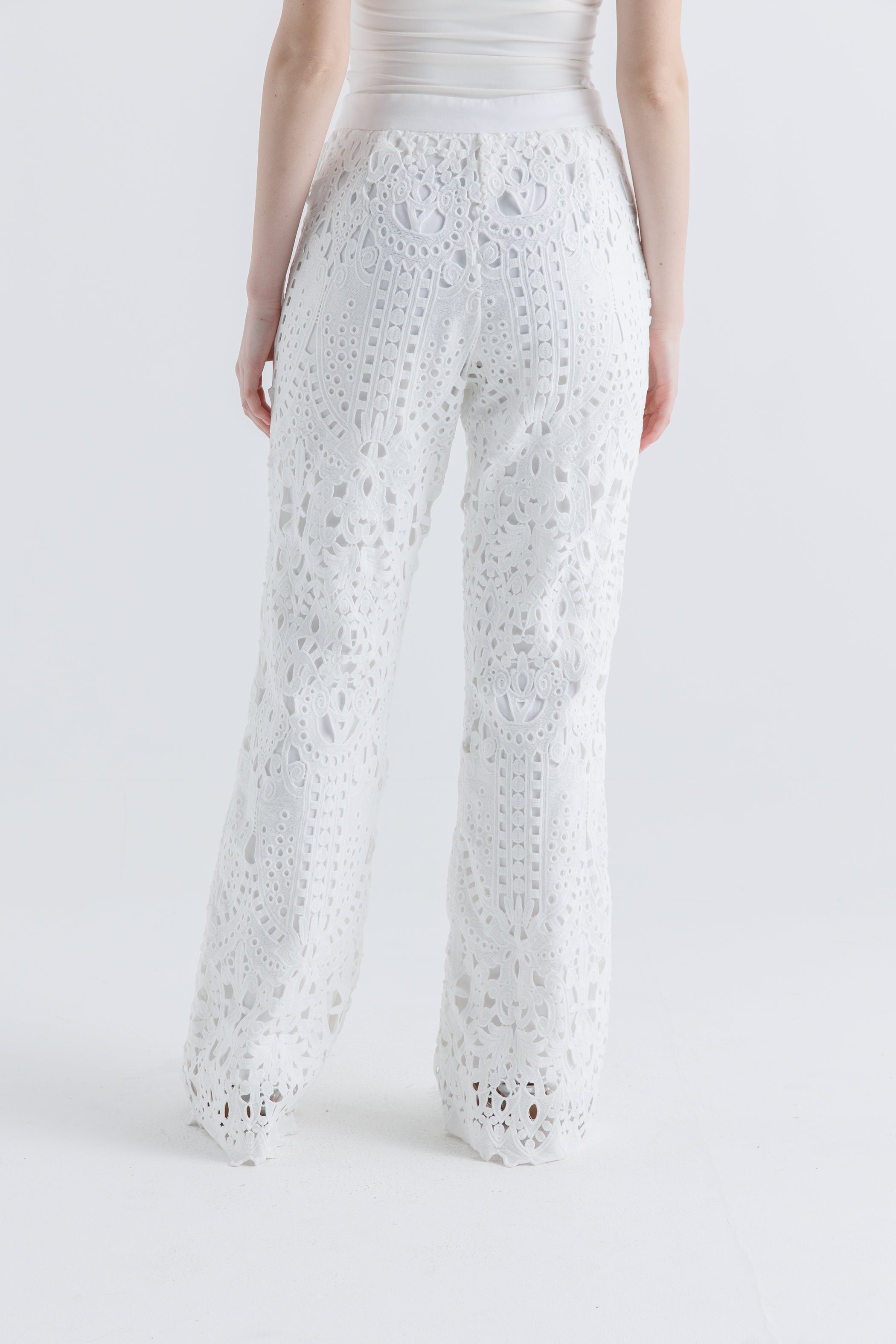 Refined and effortlessly stylish, these wide-leg pants are crafted from intricate laser-cut lace fabric, offering a fresh, breathable silhouette. The clean waistband with a front button closure ensures a structured fit, while the unlined openwork pattern delivers a modern, airy appeal. Perfect for elevated daywear or semi-formal styling.
