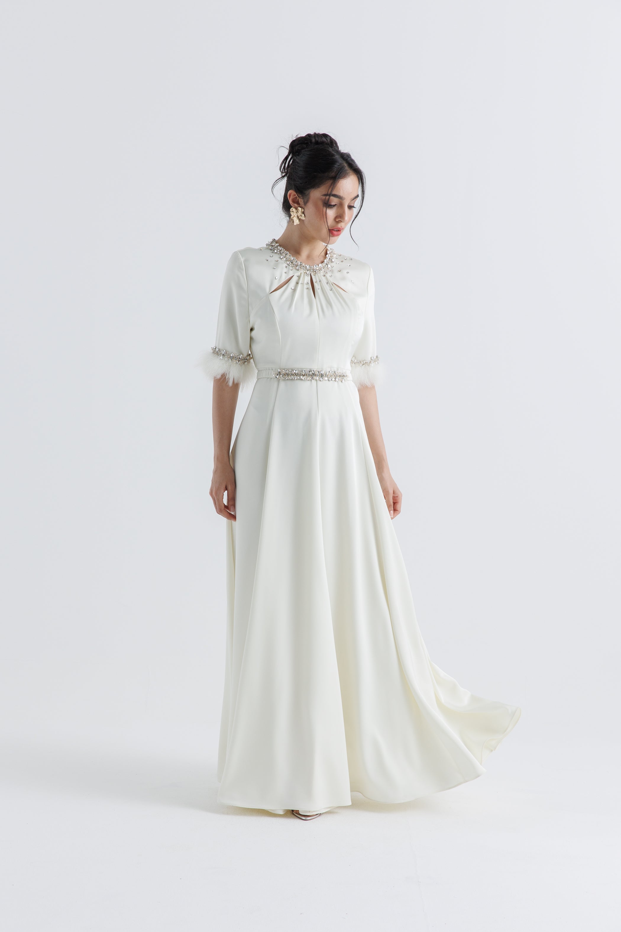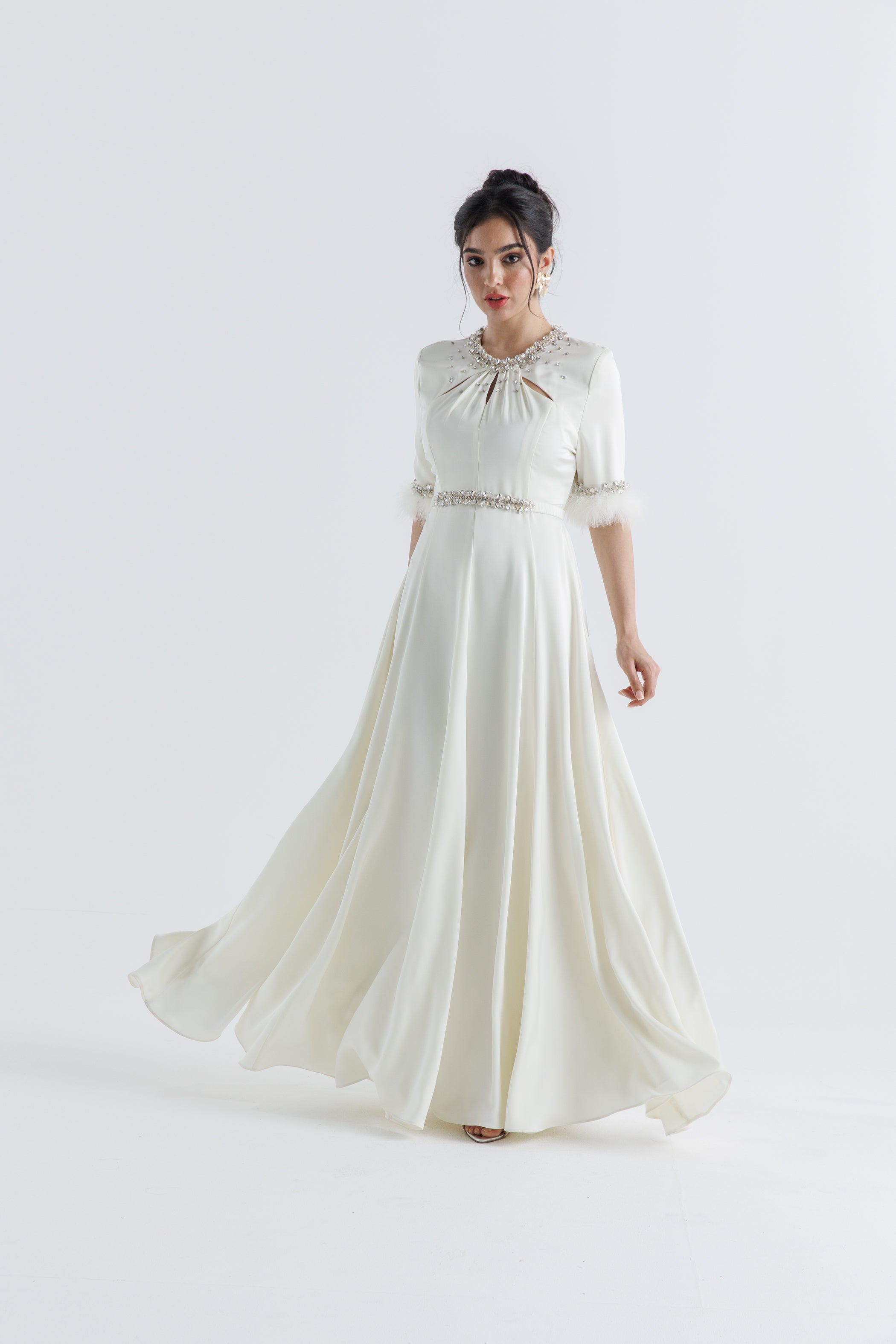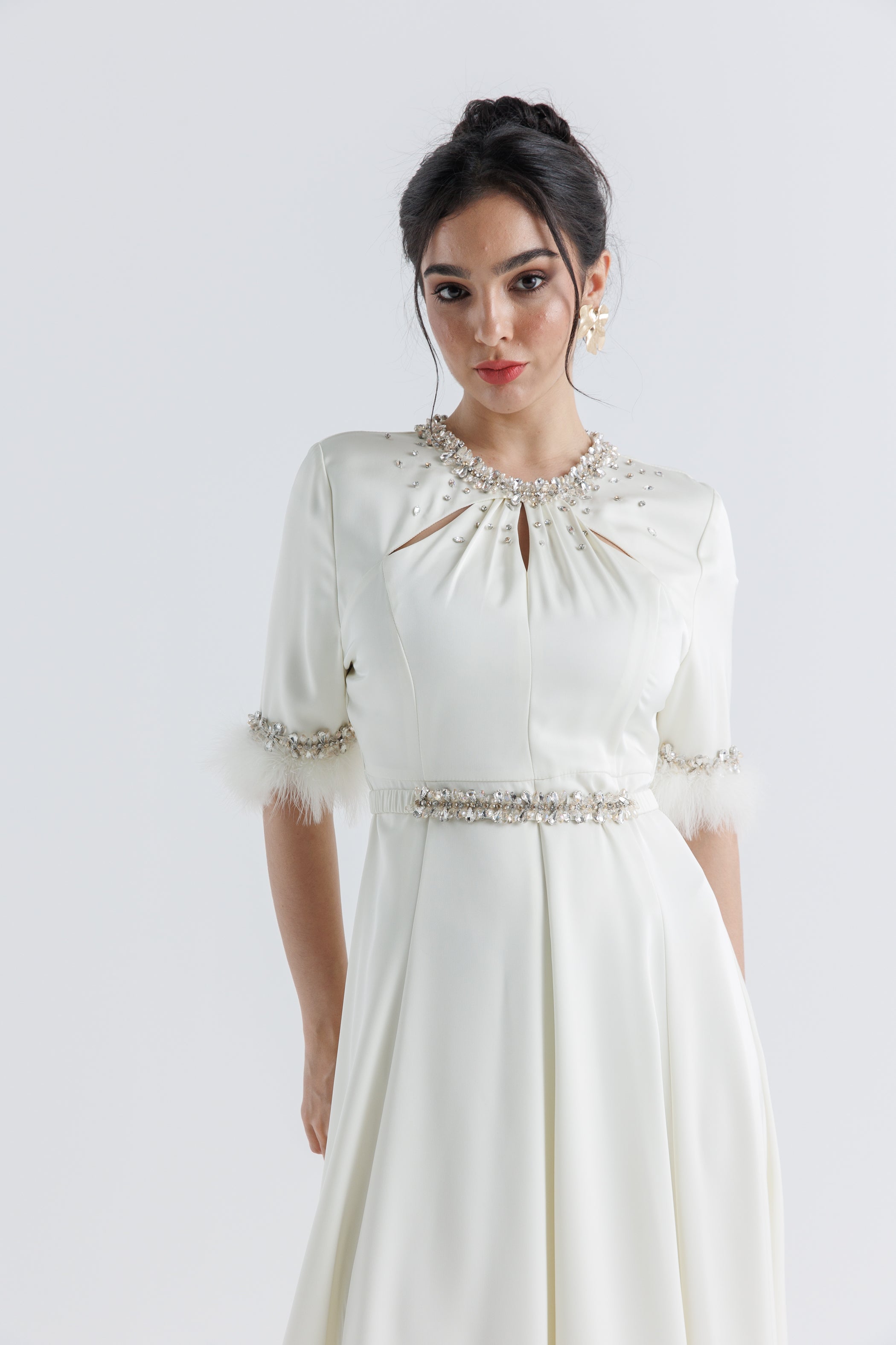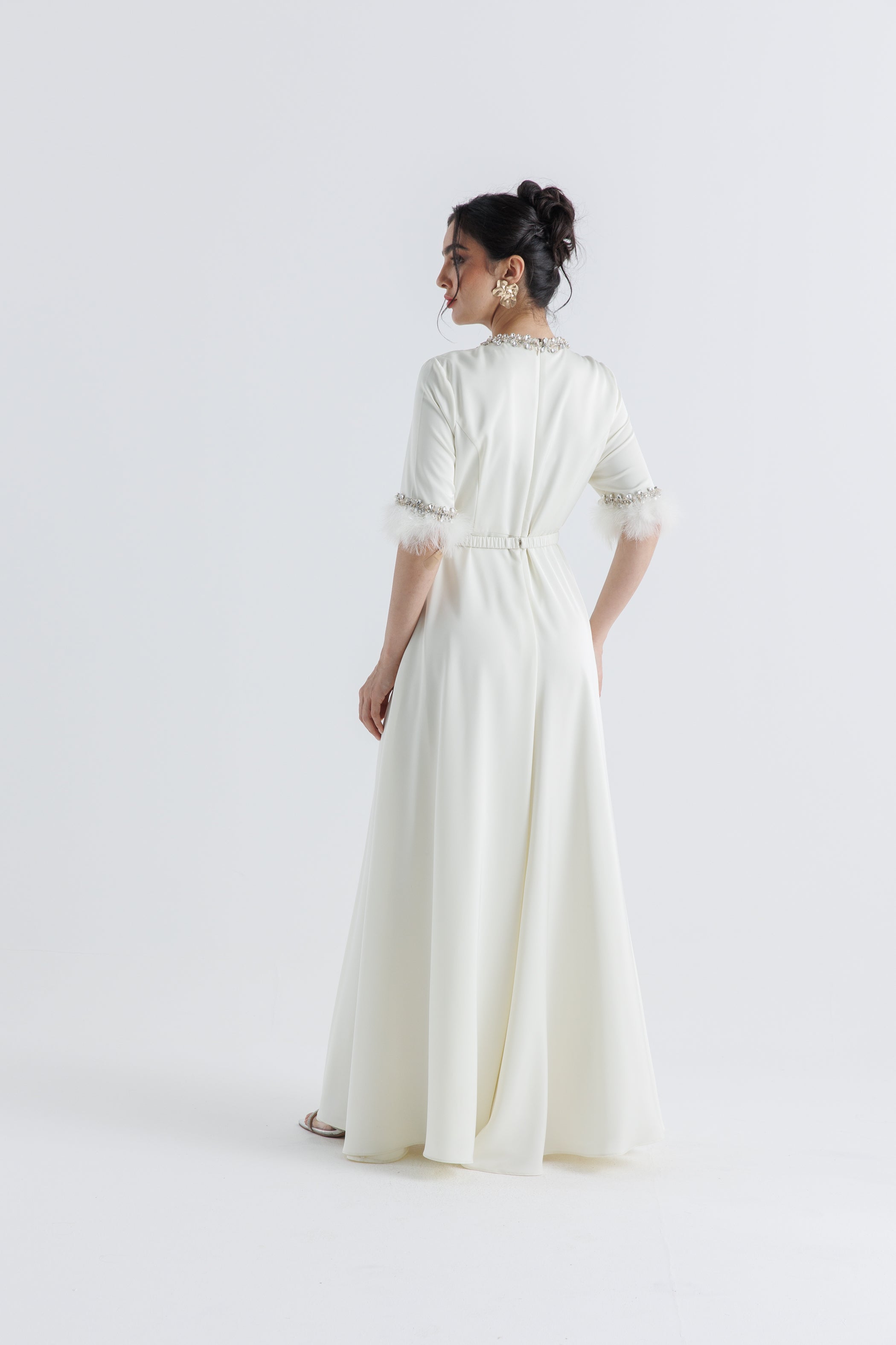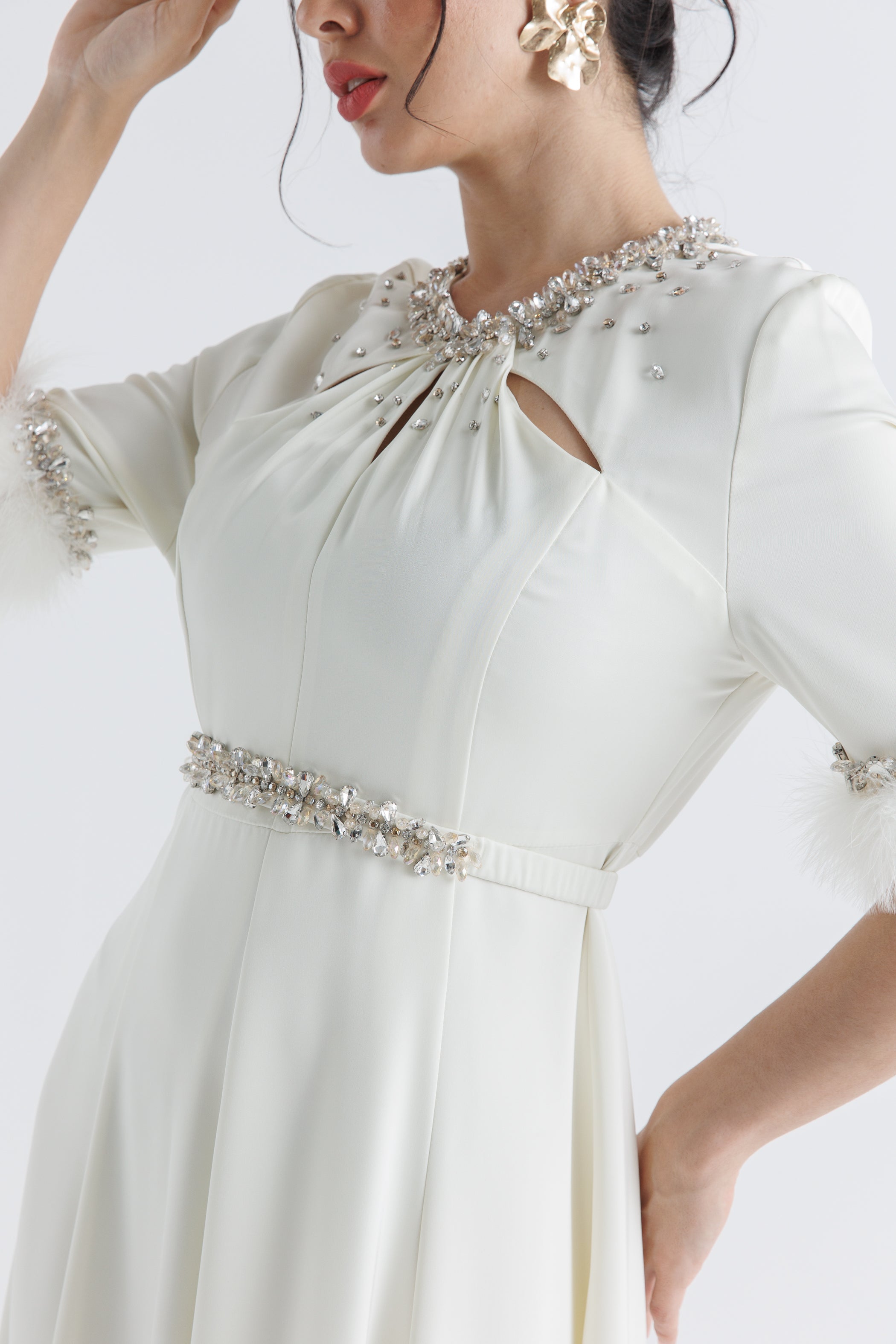 Step into luxury with the Ethereal Elegance Embellished Maxi Dress, a breathtaking design perfect for Ramadan, Eid, and grand celebrations. This 150 cm maxi dress is crafted from a premium satin blend, offering a smooth, lustrous finish with an elegant drape. The hand-embellished neckline and waistband glisten with intricate crystal detailing, adding a touch of opulence. The half sleeves, adorned with delicate feather trims and embellishments, bring a regal charm, while the fitted waistband accentuates the silhouette beautifully. Designed for effortless wear, this dress is secured with a concealed back zipper for a seamless finish.