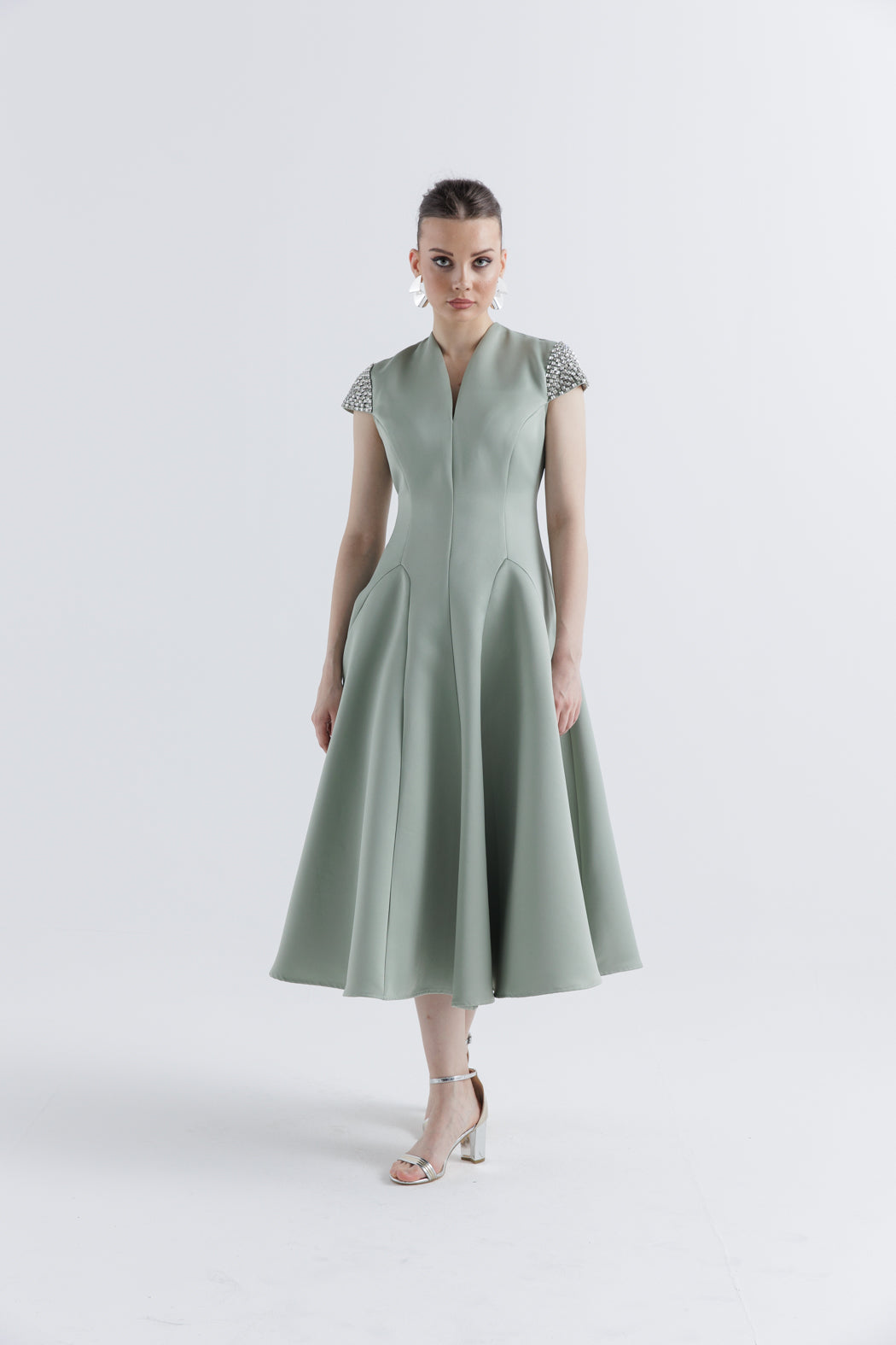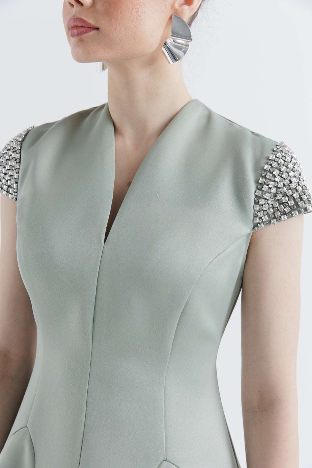 Elevate your eveningwear with this exquisitely tailored midi dress, designed to turn heads with its sculptural silhouette and dazzling details. Crafted from premium structured fabric, this dress features a sophisticated V-neckline and precise paneling that flatters the figure. The standout detail—hand-embellished crystal-studded cap sleeves—adds an elegant sparkle, making it a perfect choice for special occasions. The flared skirt adds movement and grace, while the invisible back zipper ensures a seamless fit.