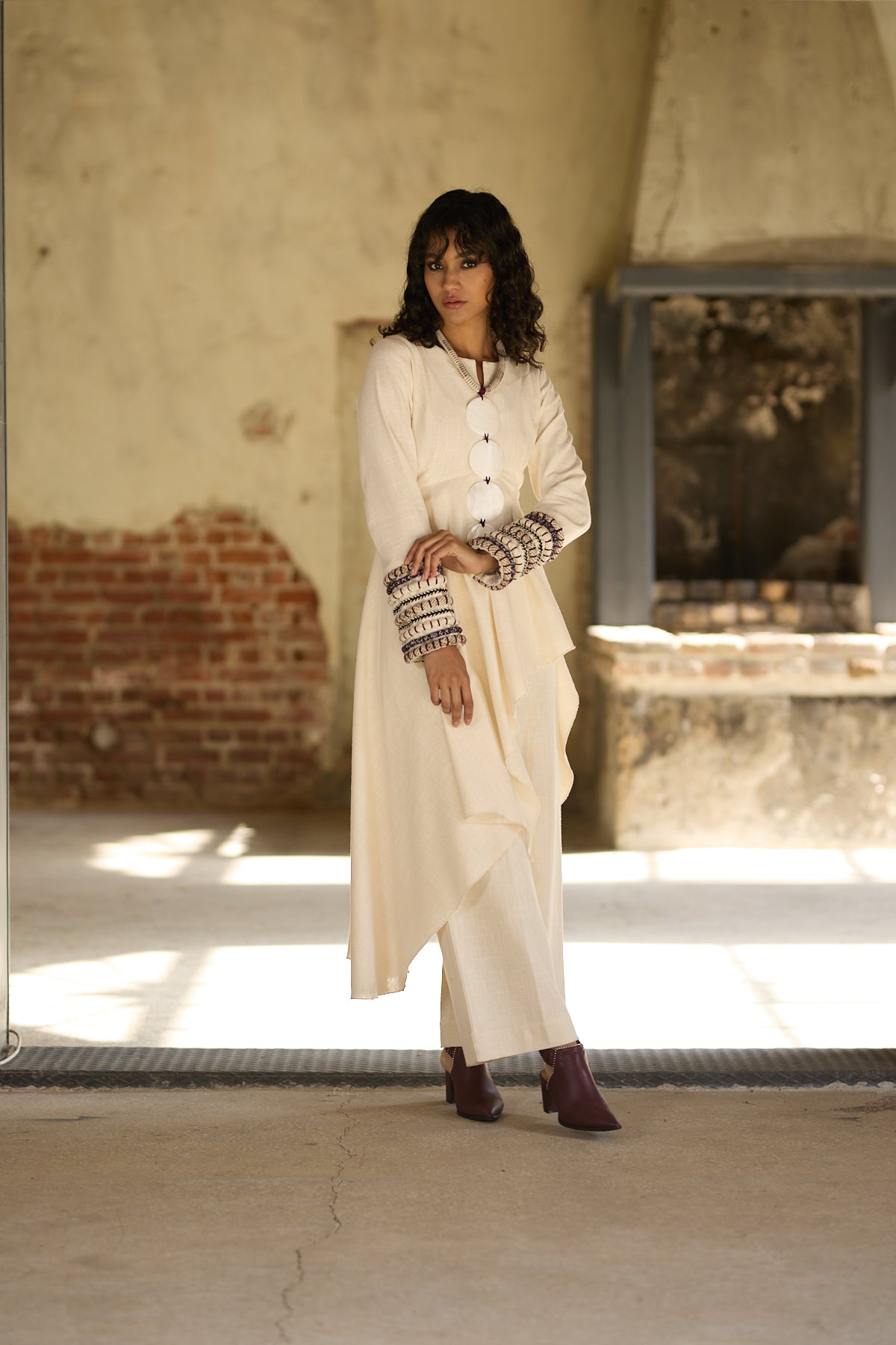 Designed by Abrar Al Mubarak, this exquisite ensemble combines traditional craftsmanship with a modern silhouette. The asymmetrical top features intricate handmade cuffs, showcasing delicate detailing that elevates the design. Paired with flowy wide-leg pants measuring approximately 103cm in length, this set is the epitome of elegance, making it a perfect choice for Ramadan and special gatherings.