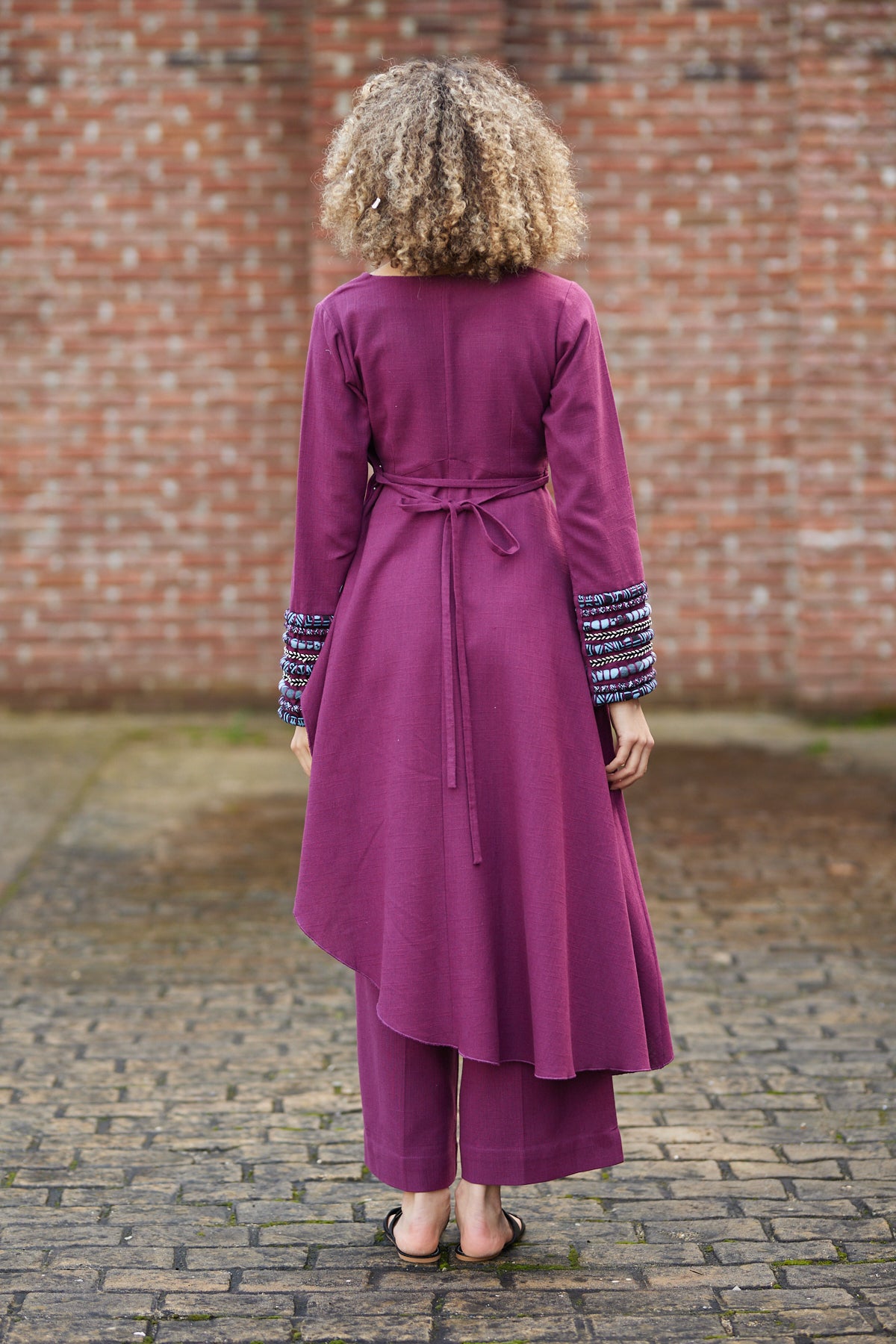 Designed by Abrar Al Mubarak, this exquisite ensemble combines traditional craftsmanship with a modern silhouette. The asymmetrical top features intricate handmade cuffs, showcasing delicate detailing that elevates the design. Paired with flowy wide-leg pants measuring approximately 103cm in length, this set is the epitome of elegance, making it a perfect choice for Ramadan and special gatherings.