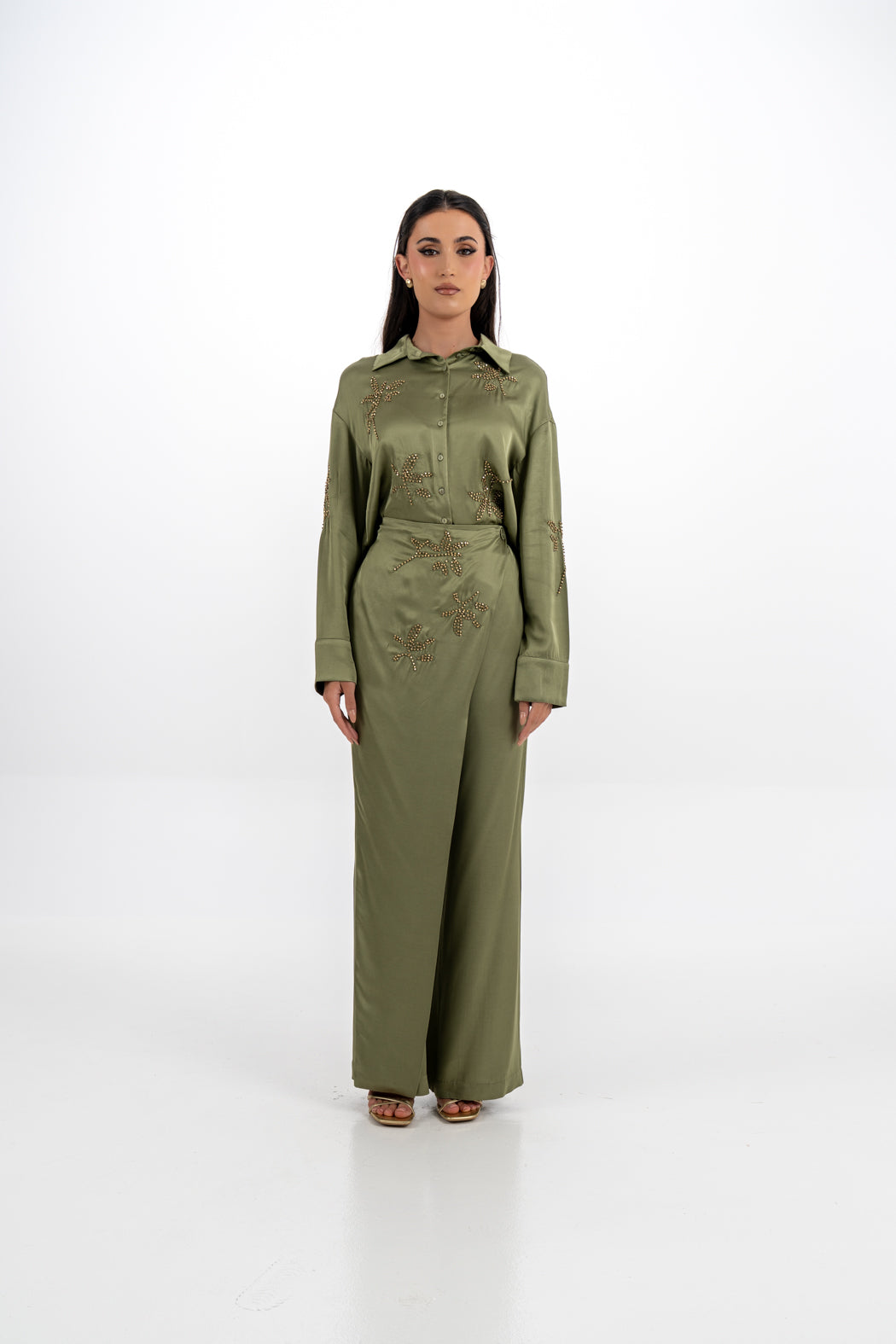 Embellished Satin Shirt with Metallic Leaf Embellishments