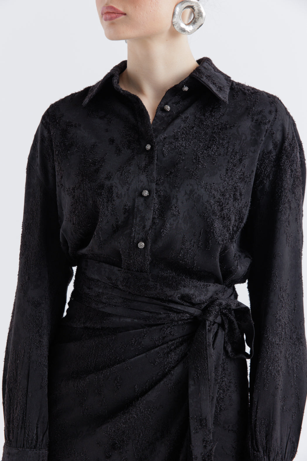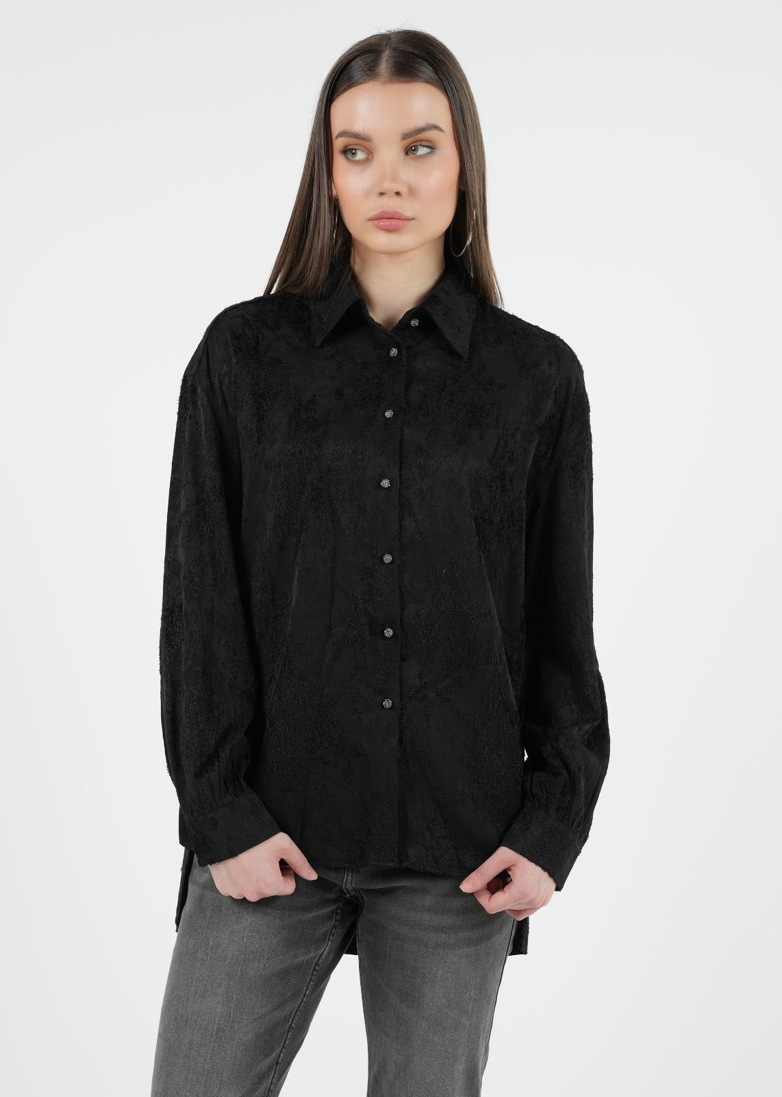 Refined elegance meets modern style with this textured black shirt, featuring exquisite stonework buttons that add a sophisticated touch of sparkle. Designed with a high-low hem—shorter in the front and longer in the back—this chic piece creates a flowy, flattering silhouette. With a relaxed fit and a front length of approximately 67cm (size S), it’s perfect for both formal and casual styling.