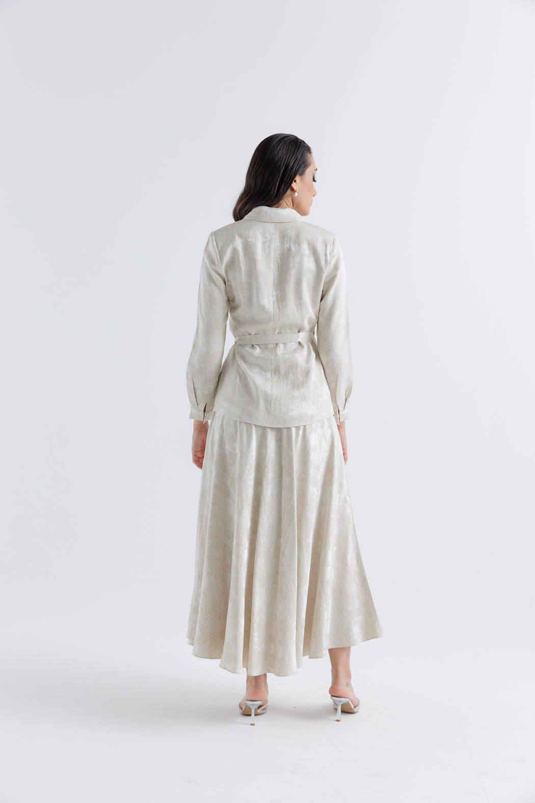 Elevate your festive wardrobe with this elegant asymmetrical jacquard satin wrap jacket, designed to bring sophistication and grace to your Ramadan and Eid celebrations. Crafted from luxurious jacquard satin with a subtle sheen, this jacket offers a structured yet feminine silhouette. The asymmetrical wrap-style front with a side tie closure ensures a flattering and modern fit, while the notched lapel adds a polished finish.