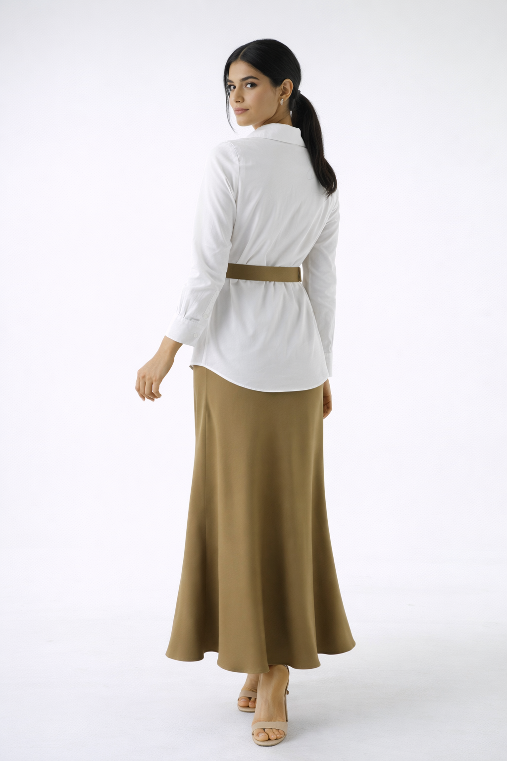 This elegant belted shirt is crafted from a smooth, premium cotton-blend fabric, offering a refined balance of structure and comfort. Designed with a classic pointed collar, concealed button-front closure, and long sleeves finished with stylish pleated cuffs, it delivers a timeless tailored look. The removable waist belt with a polished metal-ring buckle subtly defines the silhouette, while the softly curved hem and approximate length of 67 cm ensure effortless styling. Perfectly paired with skirt 2501069, this versatile piece transitions seamlessly from sophisticated daytime wear to elevated evening ensembles.