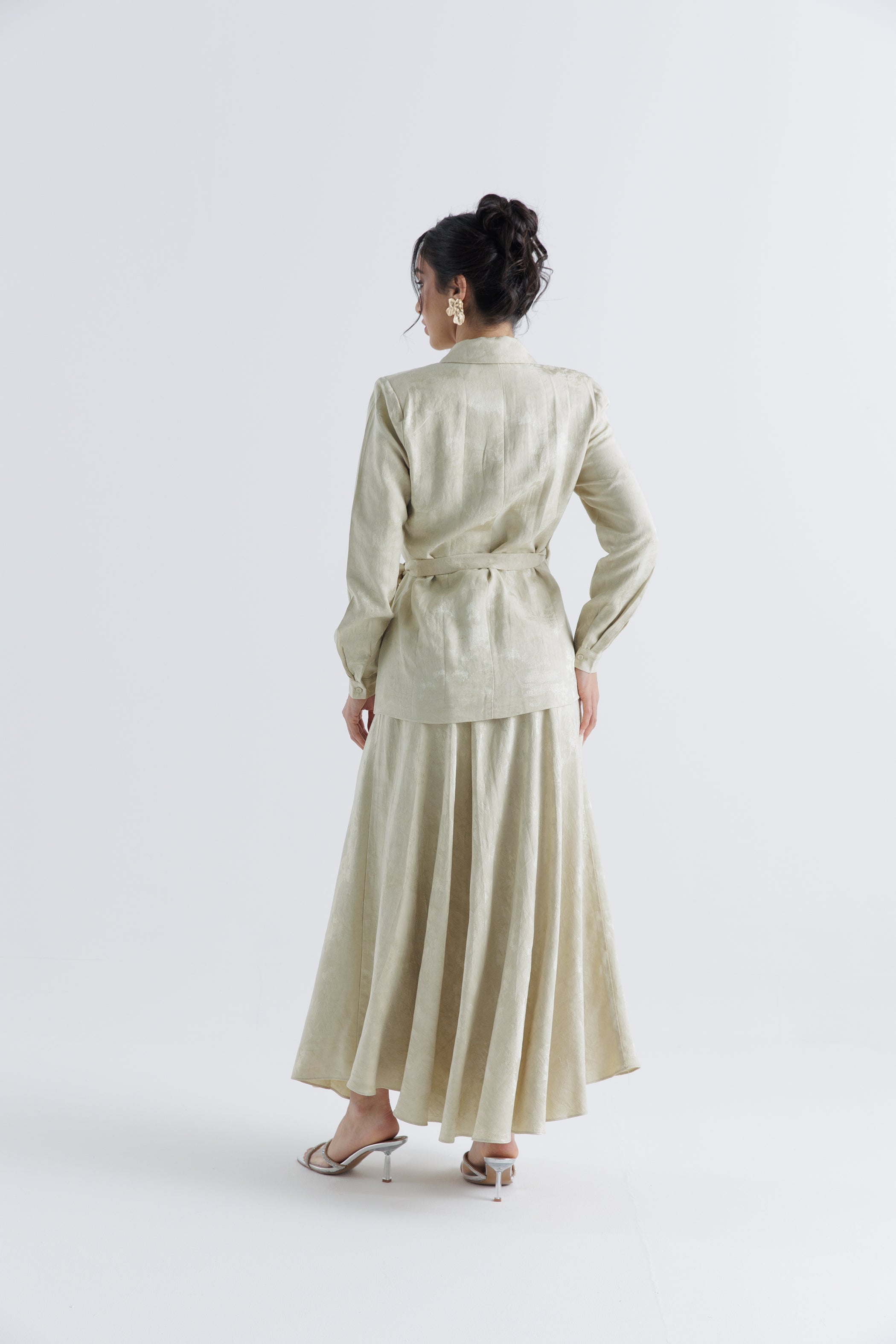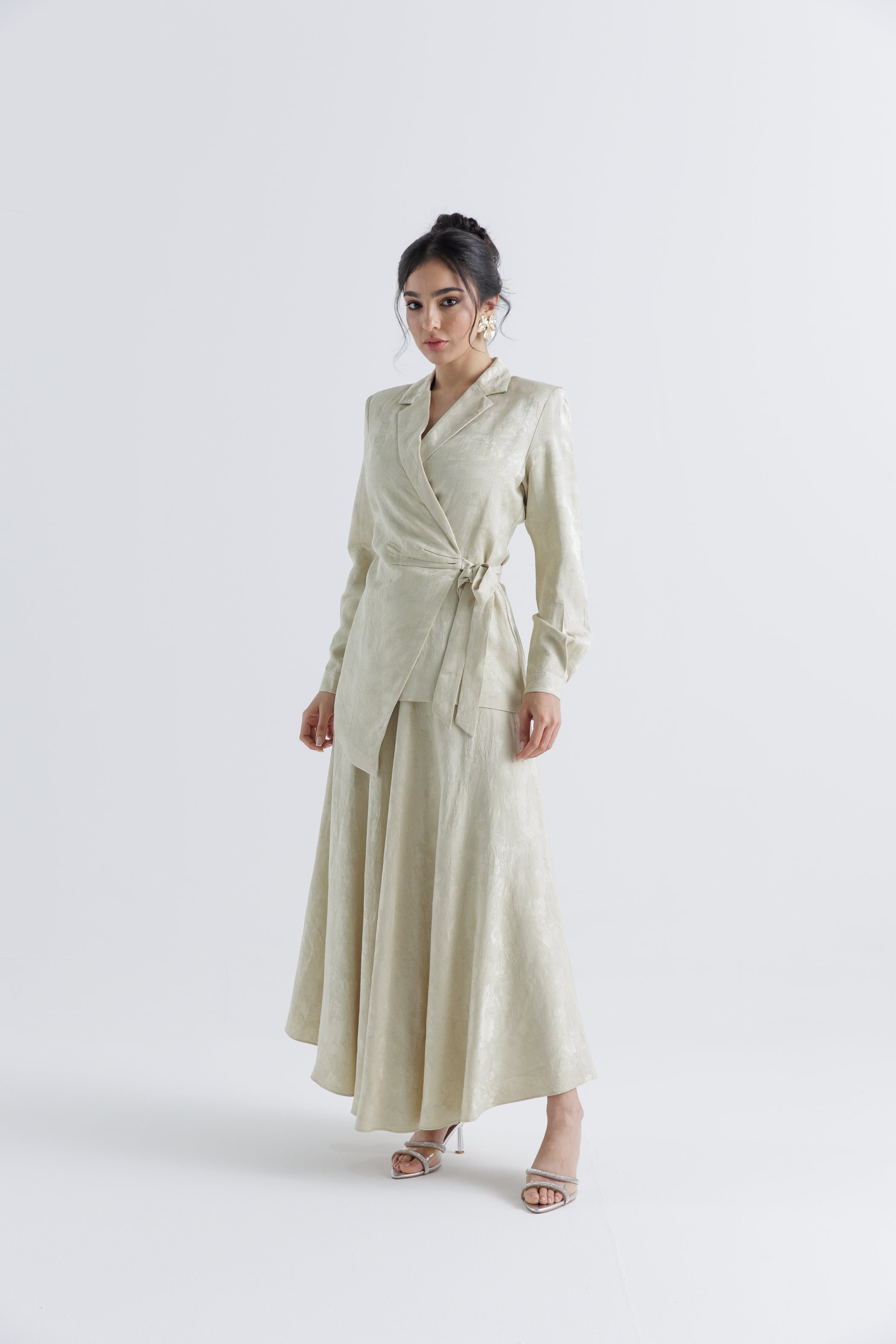 Elevate your festive wardrobe with this elegant asymmetrical jacquard satin wrap jacket, designed to bring sophistication and grace to your Ramadan and Eid celebrations. Crafted from luxurious jacquard satin with a subtle sheen, this jacket offers a structured yet feminine silhouette. The asymmetrical wrap-style front with a side tie closure ensures a flattering and modern fit, while the notched lapel adds a polished finish.