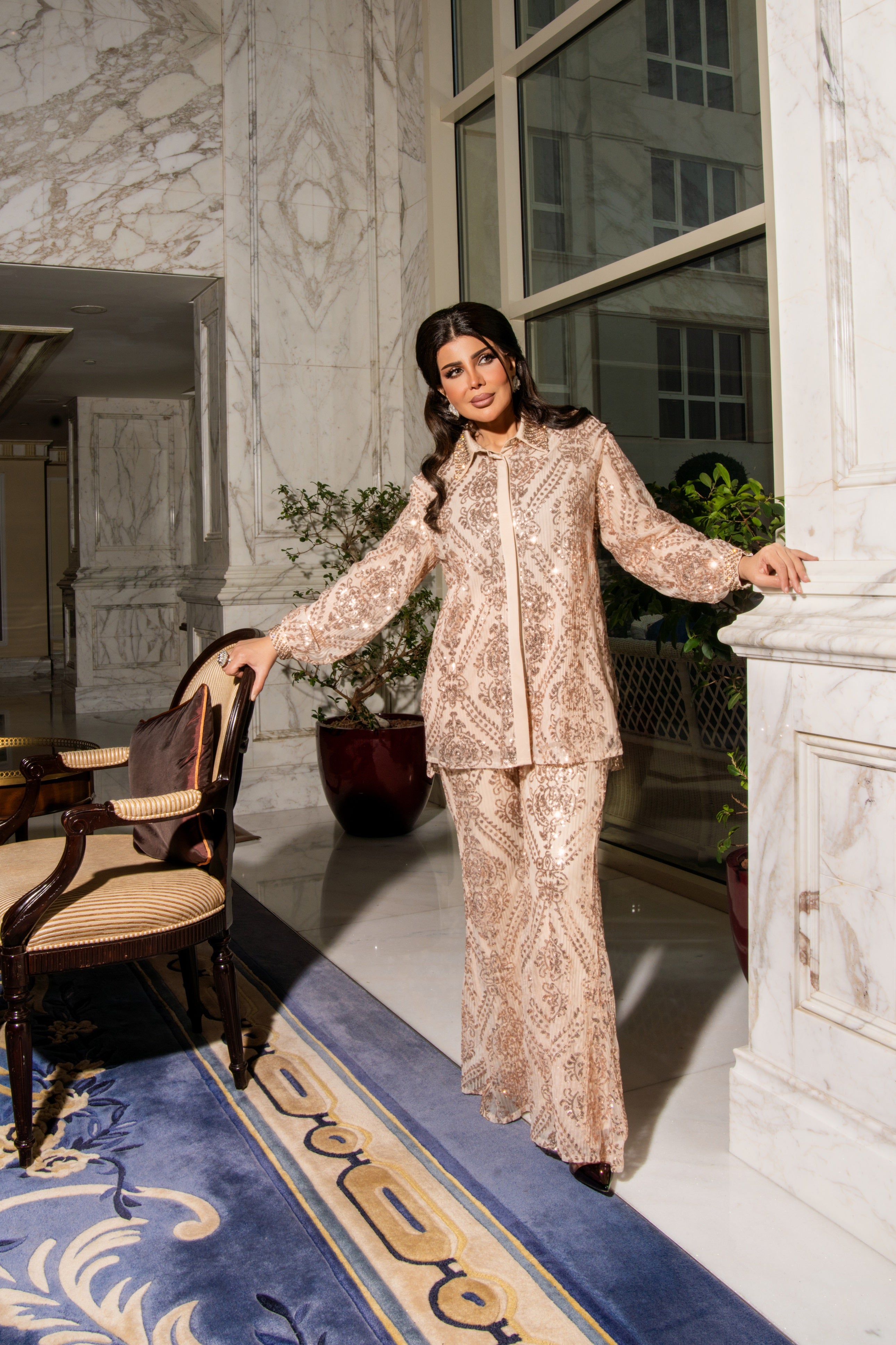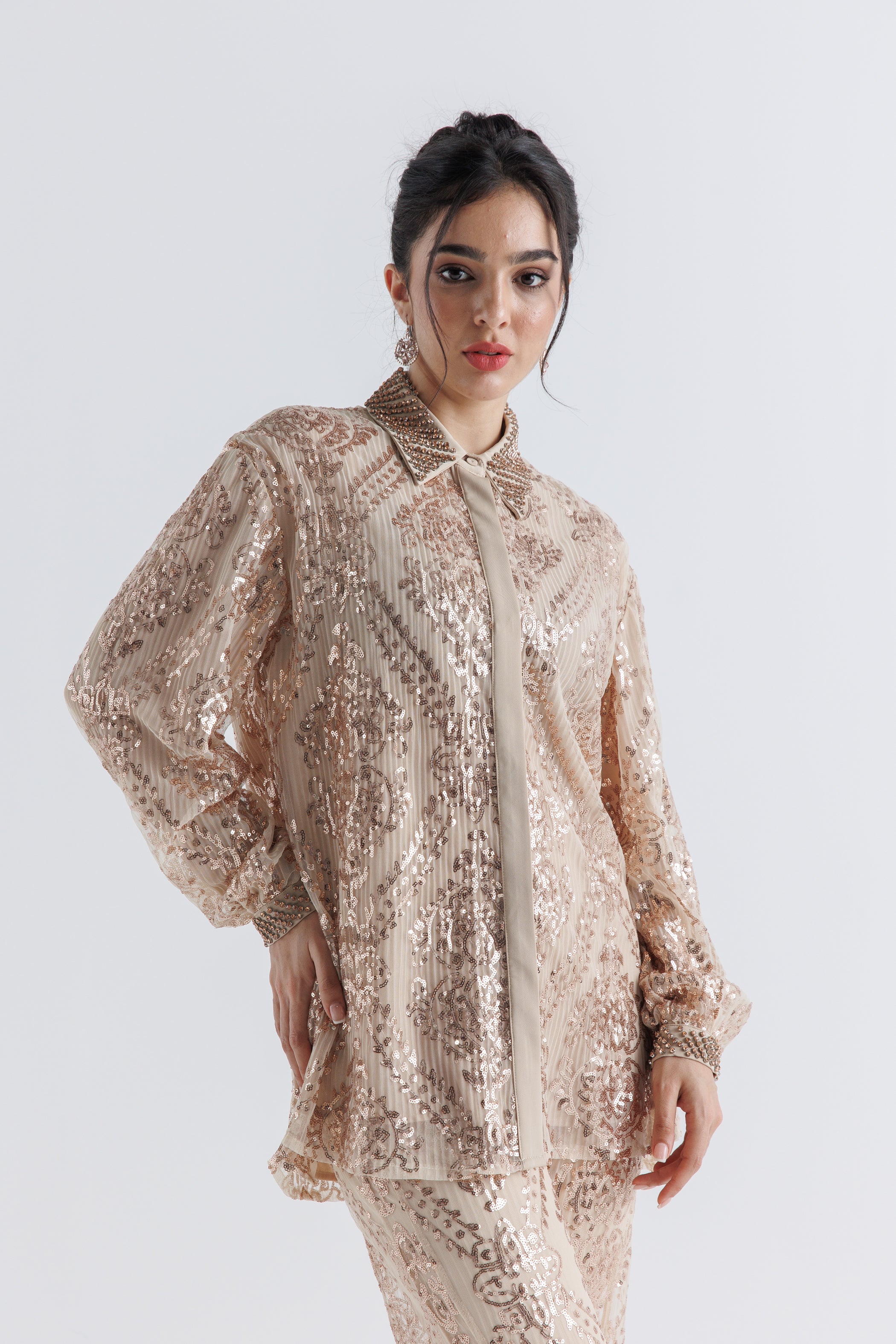 Step into elegant sparkle with this crystal and sequin embellished shirt featuring a soft high-low hem for added flair. Designed with intricate sequin embroidery over a sheer mesh base, the shirt boasts a dazzling crystal-embellished collar that brings effortless glamour. Fully lined through the body for comfort and coverage, it maintains a flowy silhouette with a concealed button placket for a sleek finish. Pair it with our matching pant (Code: 2504013) for a complete statement look.