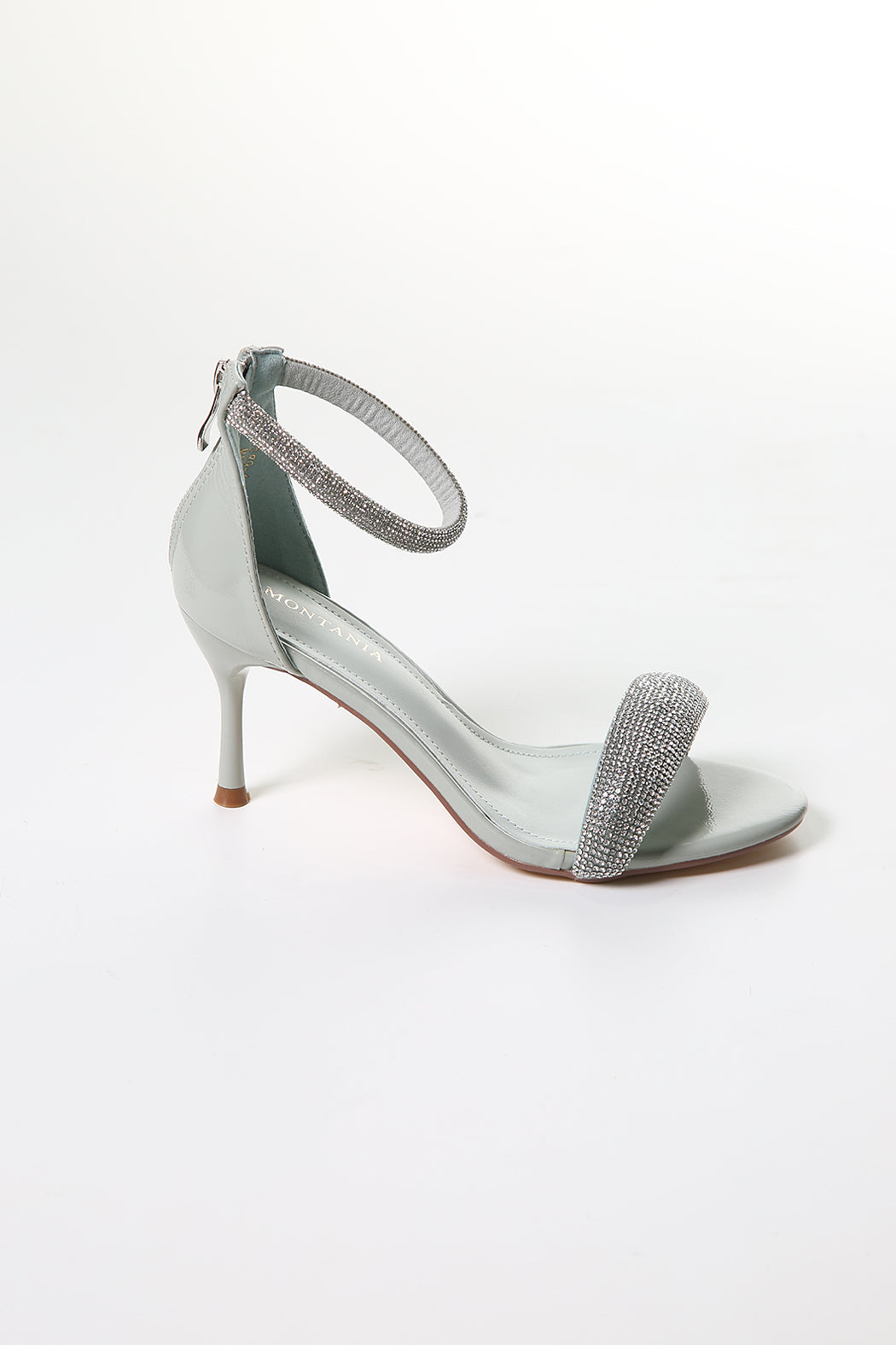 Elevate your style with these sophisticated open-toe heels from Montania. Crafted with a glossy patent finish, these heels feature a sleek stiletto design and a shimmering rhinestone-embellished ankle strap and toe band for a touch of glamour. The secure back zipper ensures easy wear and a snug fit, making them perfect for evening outings, weddings, and formal occasions. Available in soft beige and icy blue tones to complement a wide range of outfits.
