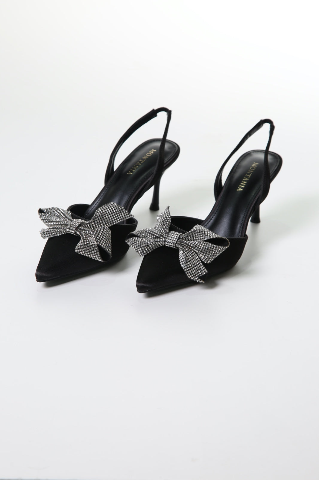 Make every step sparkle with these luxurious satin slingback heels from Montania. Designed with a pointed toe and adorned with a shimmering crystal bow, these heels are the definition of sophistication and glamour. The mid-height stiletto heel offers an elegant lift while maintaining comfort, making them perfect for evening occasions, weddings, or upscale gatherings. Available in classic black or radiant ivory, these heels are a timeless addition to your wardrobe.
