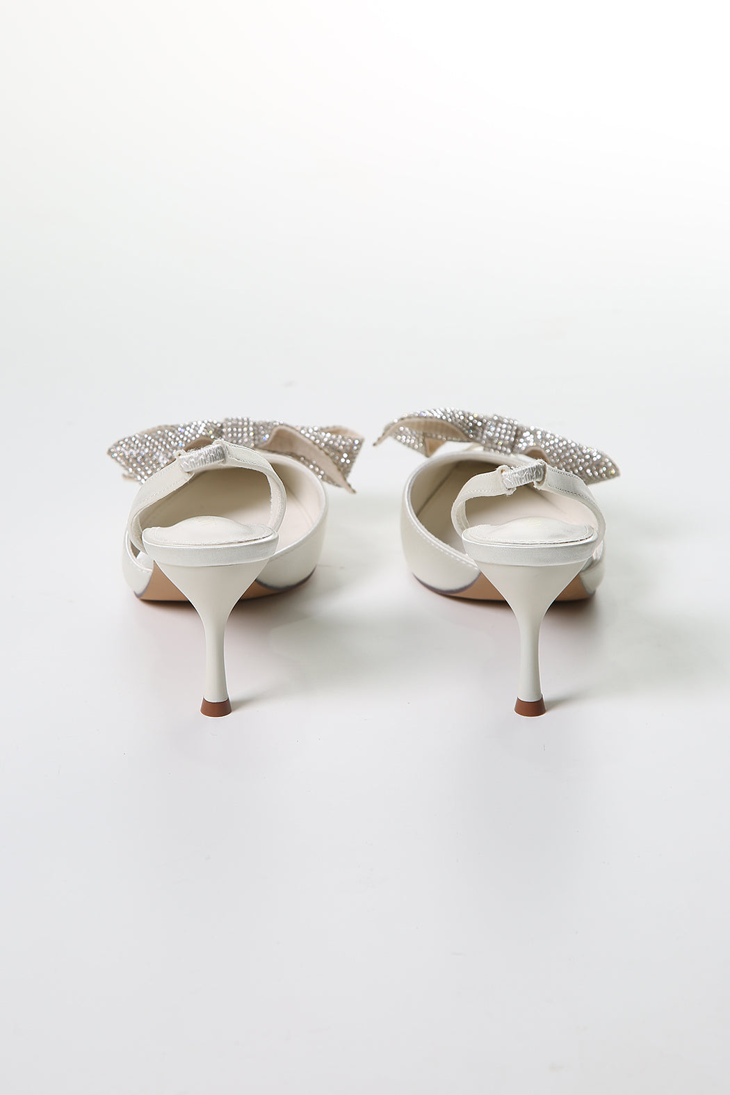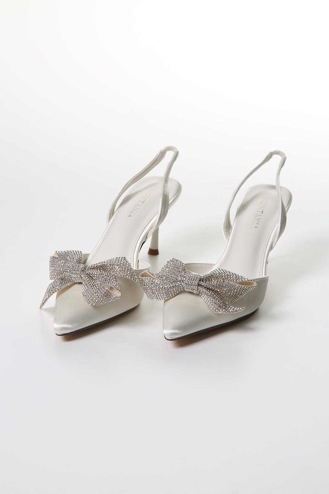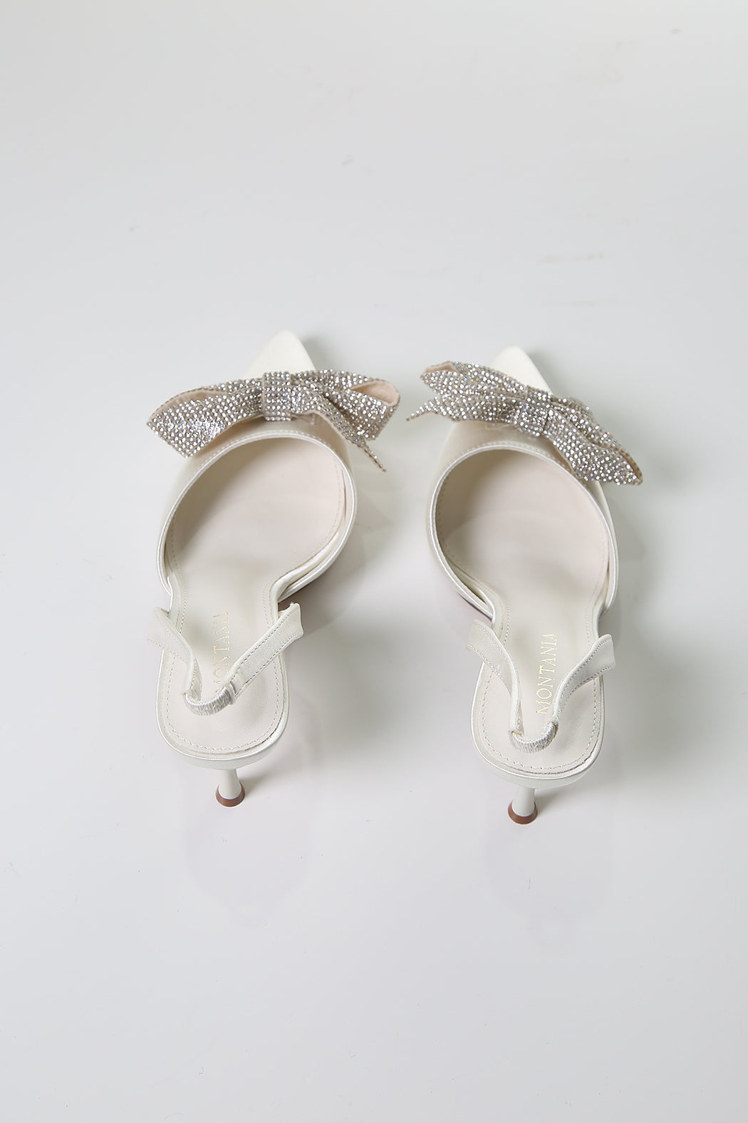 Make every step sparkle with these luxurious satin slingback heels from Montania. Designed with a pointed toe and adorned with a shimmering crystal bow, these heels are the definition of sophistication and glamour. The mid-height stiletto heel offers an elegant lift while maintaining comfort, making them perfect for evening occasions, weddings, or upscale gatherings. Available in classic black or radiant ivory, these heels are a timeless addition to your wardrobe.
