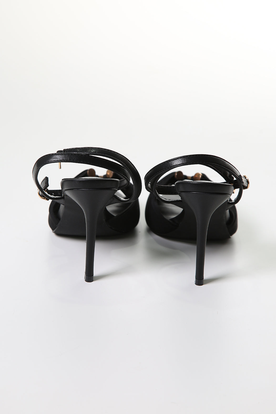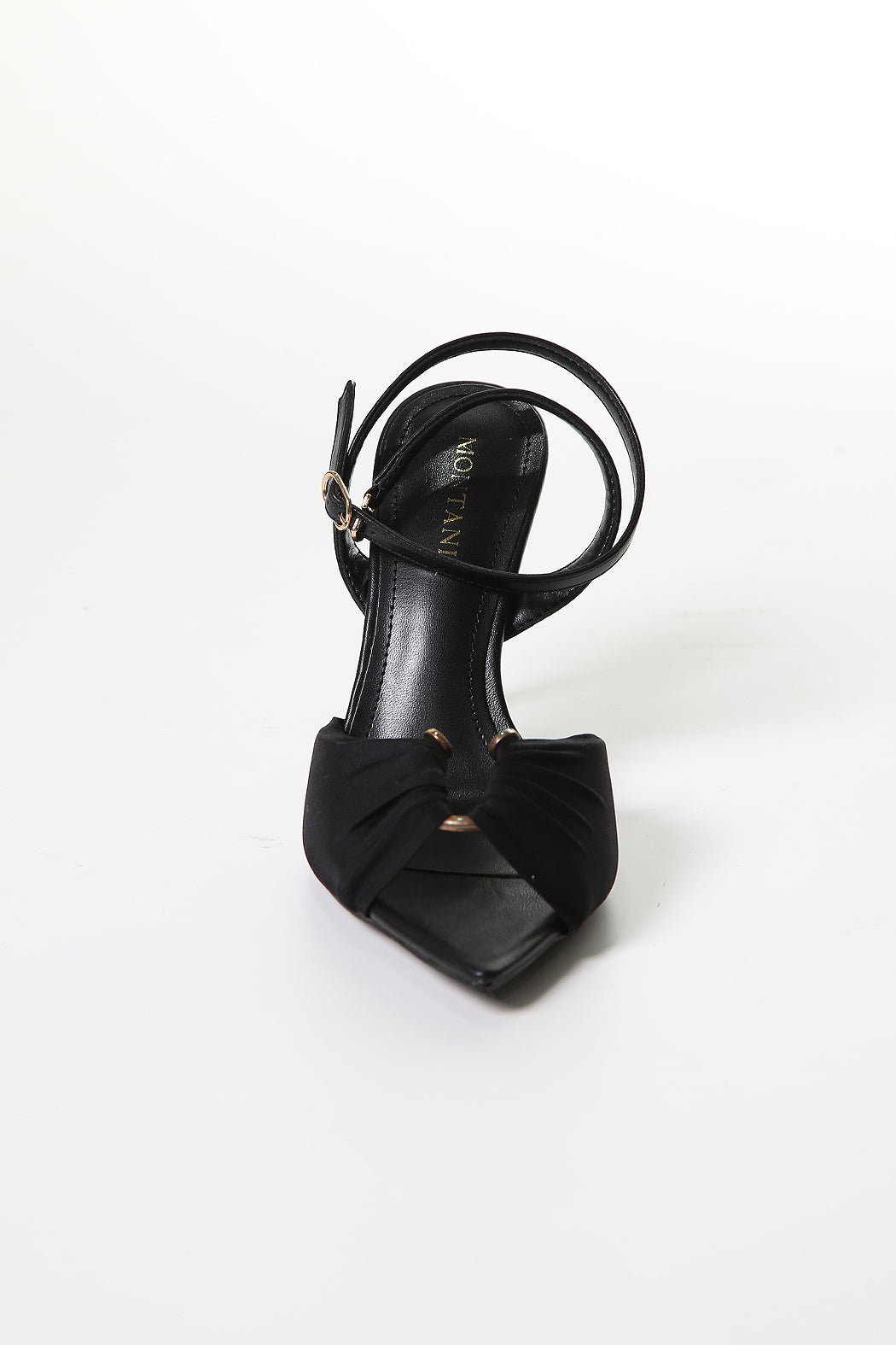 Add a statement touch to your wardrobe with these sophisticated open-toe heels from Montania. Designed with a ruched satin front, gracefully gathered into a polished metal ring, this pair blends elegance with modern flair. The double ankle straps with a gold-tone buckle provide a secure and stylish fit, while the high stiletto heel and square toe enhance your silhouette. Available in classic black, bold red, and soft beige, these heels are perfect for evening events, formal occasions, or stylish nights out.