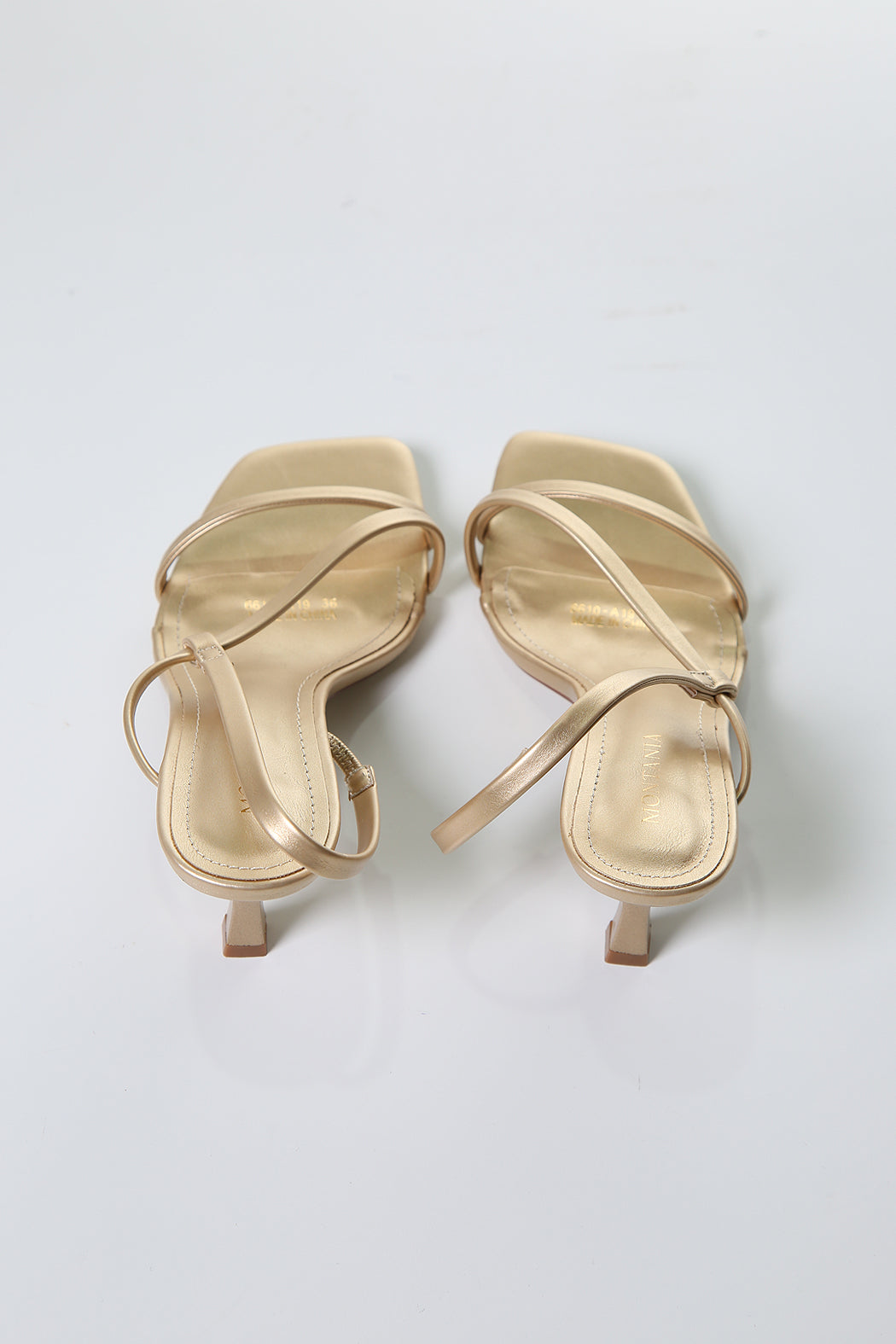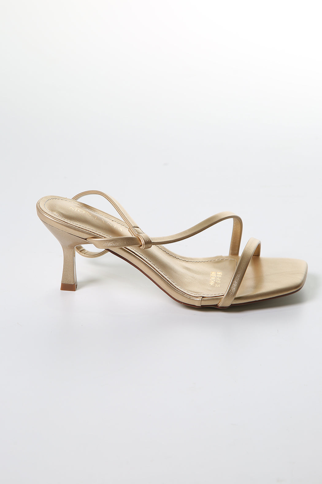 Step into subtle sophistication with these metallic gold strap sandals from Montania. Designed with a clean minimalist aesthetic, this pair features slim asymmetrical straps and a modern square toe, creating a sleek, contemporary silhouette. The mid-height flared heel offers just the right lift for day-to-night wear, making them a versatile choice for events, outings, or casual elegance. The soft metallic finish adds a touch of glam while remaining refined and wearable.
