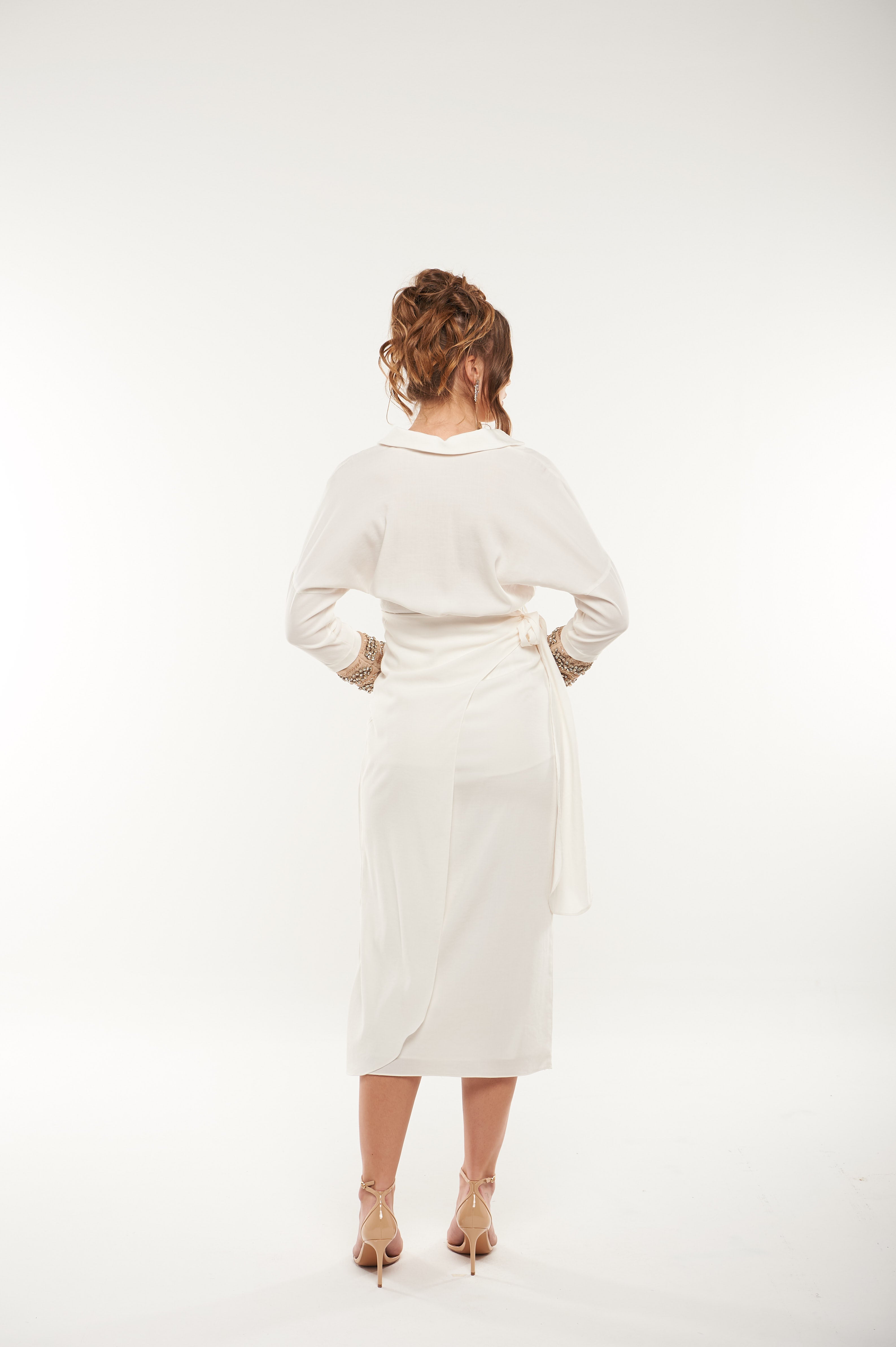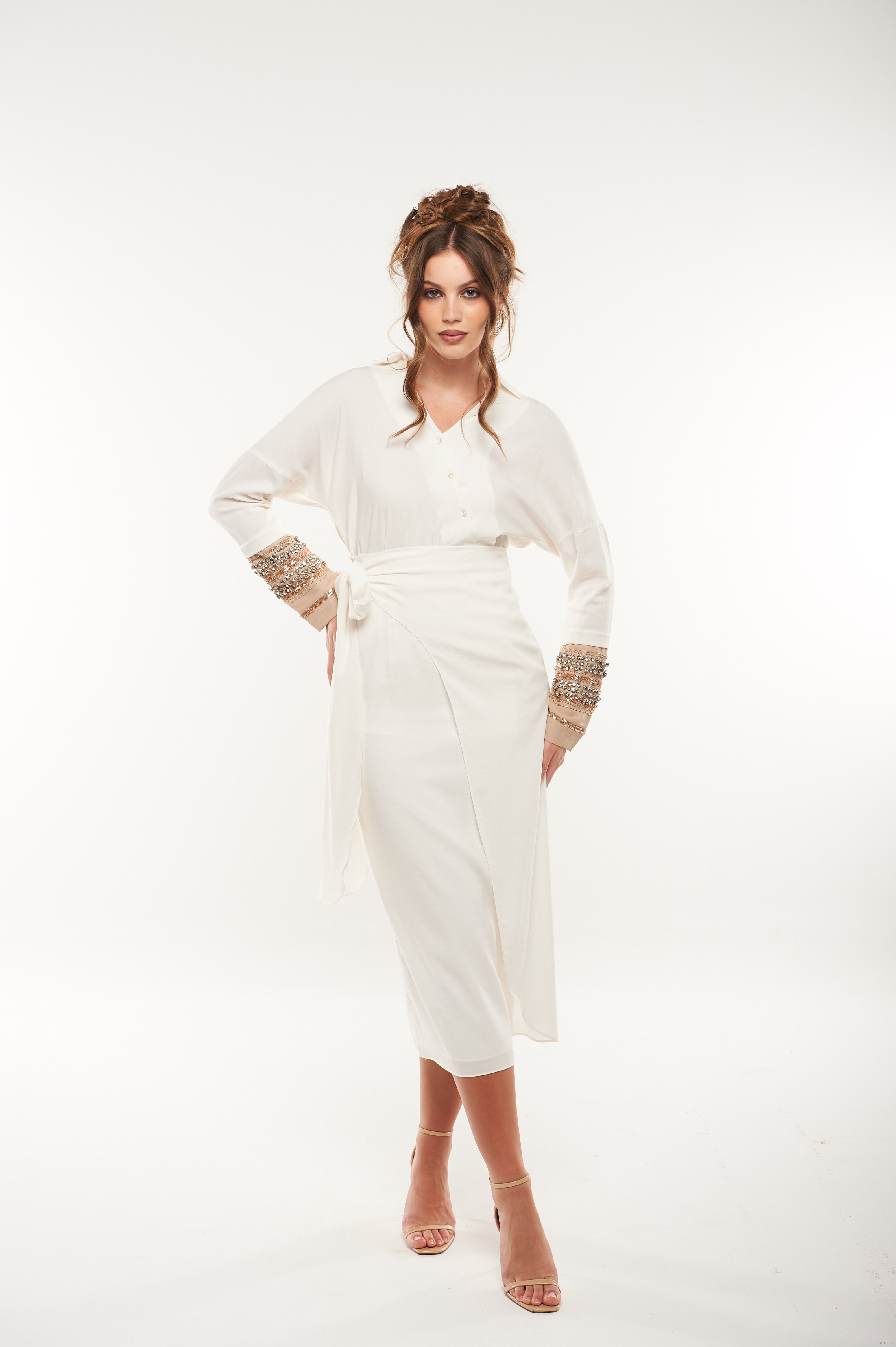 Step into effortless elegance with this chic wrap-style midi skirt, designed with a flattering silhouette and graceful movement. Featuring a soft drape and a self-tie detail at the waist, this skirt combines sophistication with comfort—perfect for both casual days and elevated evenings.