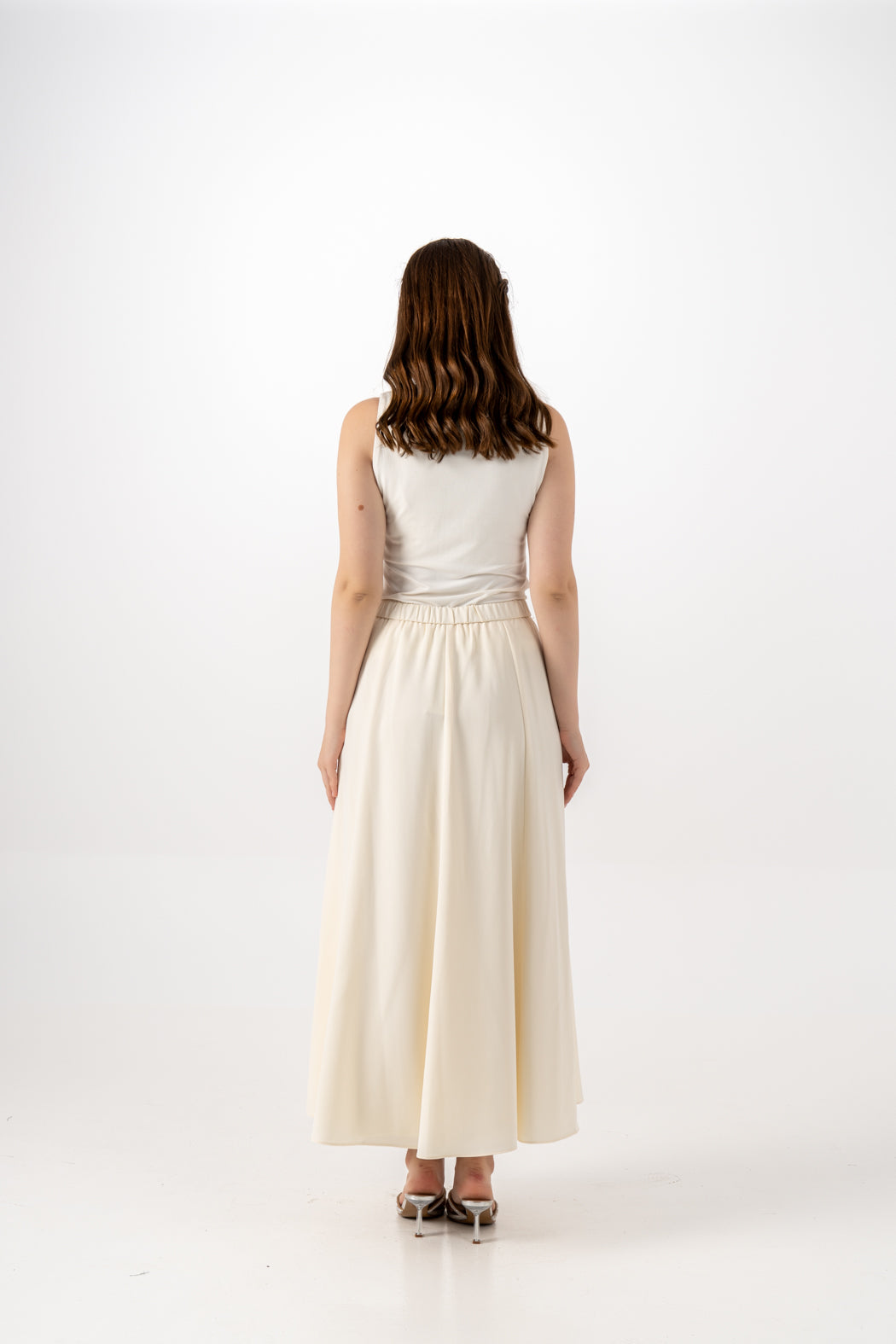 This elegant midi skirt brings timeless style and modern comfort together. With soft pleats and a flowing A-line cut, it flatters all body types. The elasticated back waistband ensures a comfortable fit, making it a versatile piece for both casual and formal wear.