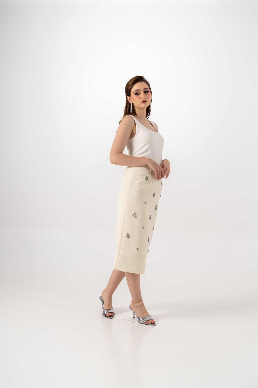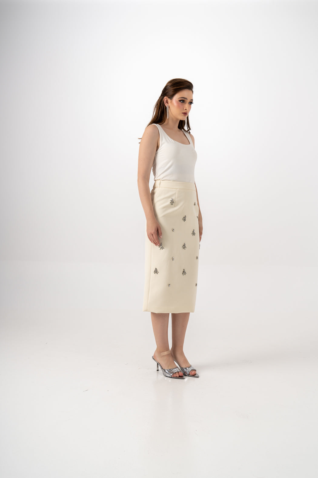 Elevate your wardrobe with this sophisticated midi skirt adorned with delicate bead and stone embellishments throughout. Tailored...