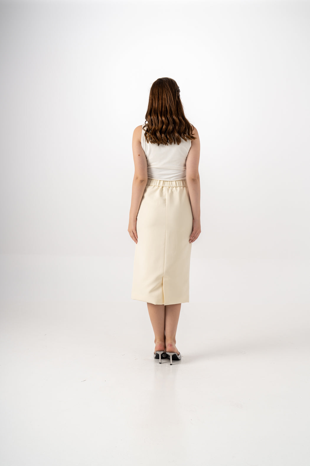 Elevate your wardrobe with this sophisticated midi skirt adorned with delicate bead and stone embellishments throughout. Tailored in a straight-cut silhouette, the skirt offers a flattering fit with a smooth front and elasticated back waistband for added comfort. The refined midi length is complemented by a back slit for ease of movement, making it a perfect choice for formal gatherings or elegant evenings.