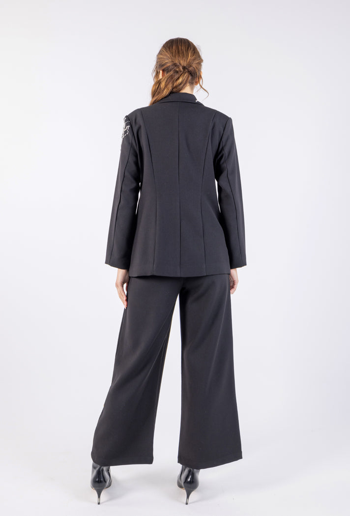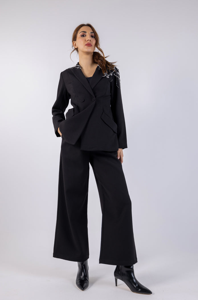 Elevate your wardrobe with this exquisite handmade embellished black double-breasted jacket. Adorned with intricate crystal embellishments on the shoulders, this jacket exudes timeless elegance and sophistication. The structured fit, notched lapel collar, and flap pockets offer a chic yet practical look, making it perfect for special occasions or stylish office wear.