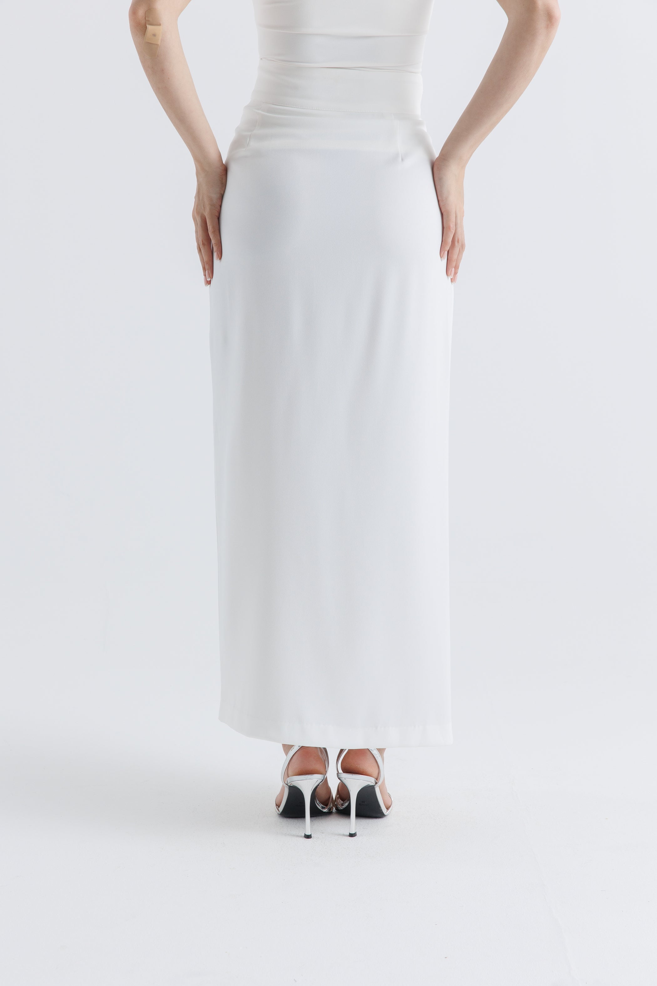 This draped tulip-cut skirt is the epitome of refined minimalism. Crafted from soft, fluid fabric, it features elegant front pleats and a high waistband that defines the silhouette with subtle structure. The asymmetrical hem adds graceful movement and a modern twist, making it perfect for pairing with fitted tops or dressy blouses for both day and evening looks.