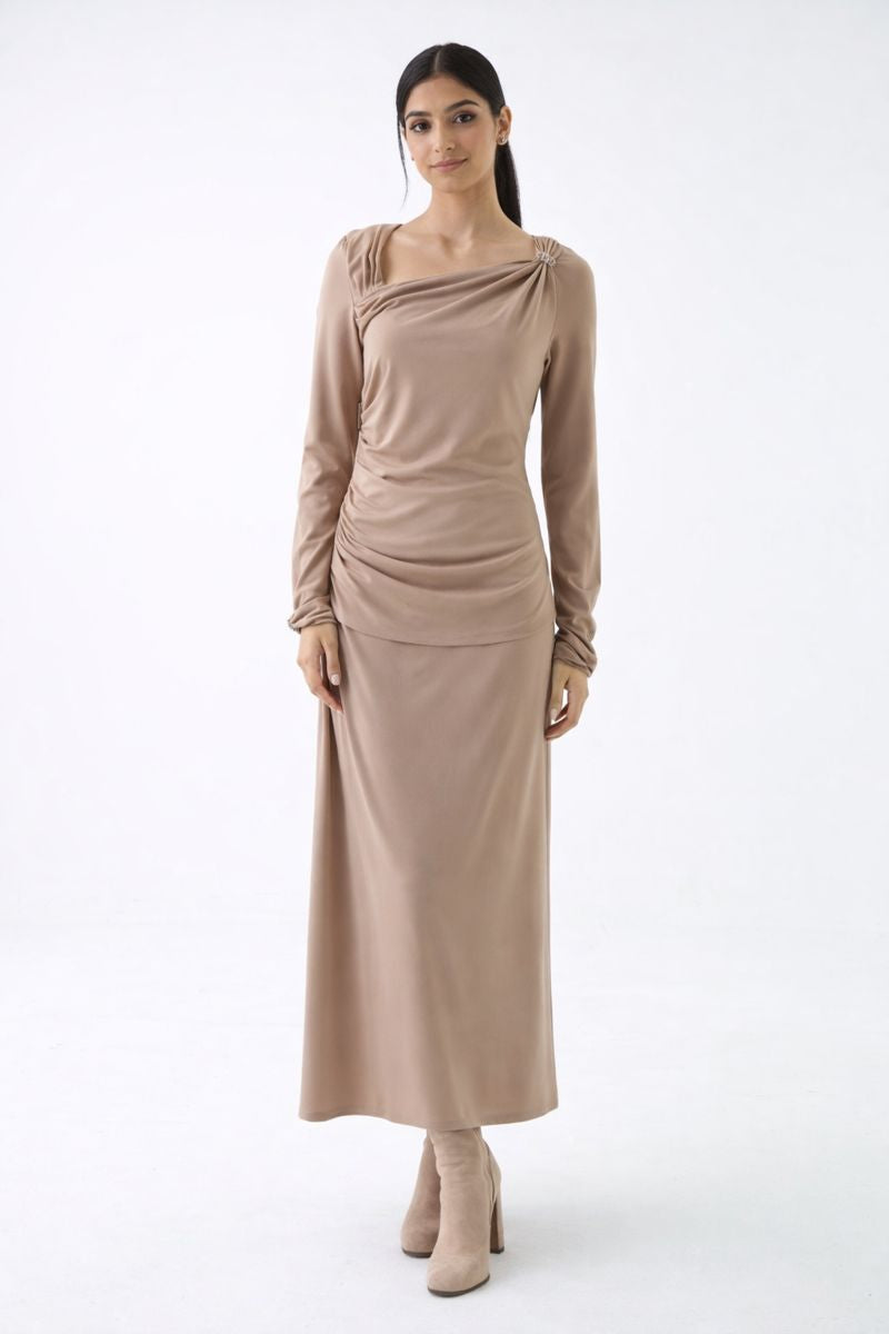 This refined asymmetric blouse is designed to elevate modern occasion wear with understated luxury. A softly gathered neckline is accented with delicate embellished bead detailing, creating an elegant focal point that enhances the silhouette.