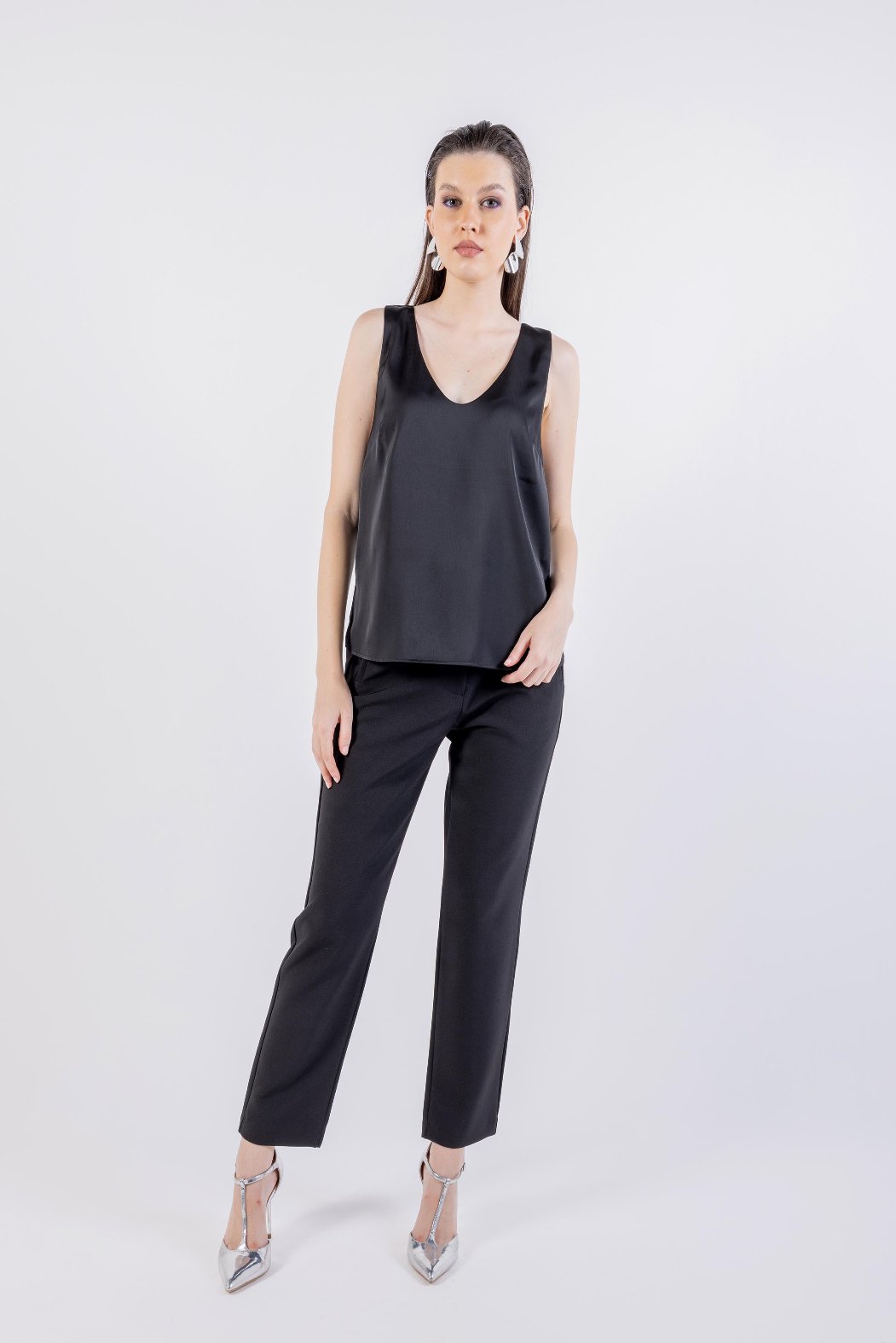 This classic sleeveless tank top features a flattering V-neck design, making it a versatile staple for any wardrobe. Crafted from soft, high-quality fabric, it offers a comfortable fit that drapes elegantly against the body. The solid color allows for effortless styling, easily pairing with jeans, skirts, or shorts for a casual look, or layering under blazers and cardigans for a more polished ensemble. Perfect for warm weather or as a layering piece in cooler months, the solid V-neck sleeveless tank top is an essential item that combines simplicity with chic elegance, ideal for both everyday wear and special occasions.