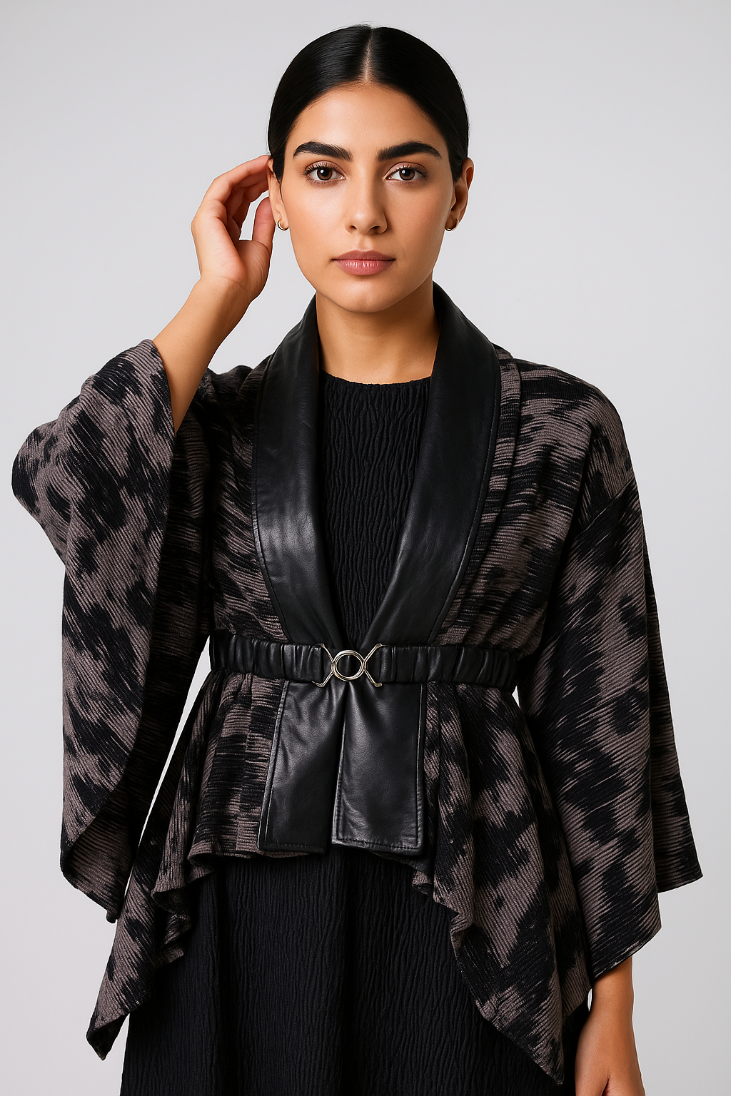 A statement layering piece designed to elevate simple outfits with bold style. This printed kimono-style jacket features a dramatic blend of red and black tones, complemented by a sleek faux-leather lapel for a modern, luxurious finish. Its relaxed silhouette and flowing sleeves make it an effortlessly chic addition to any wardrobe.