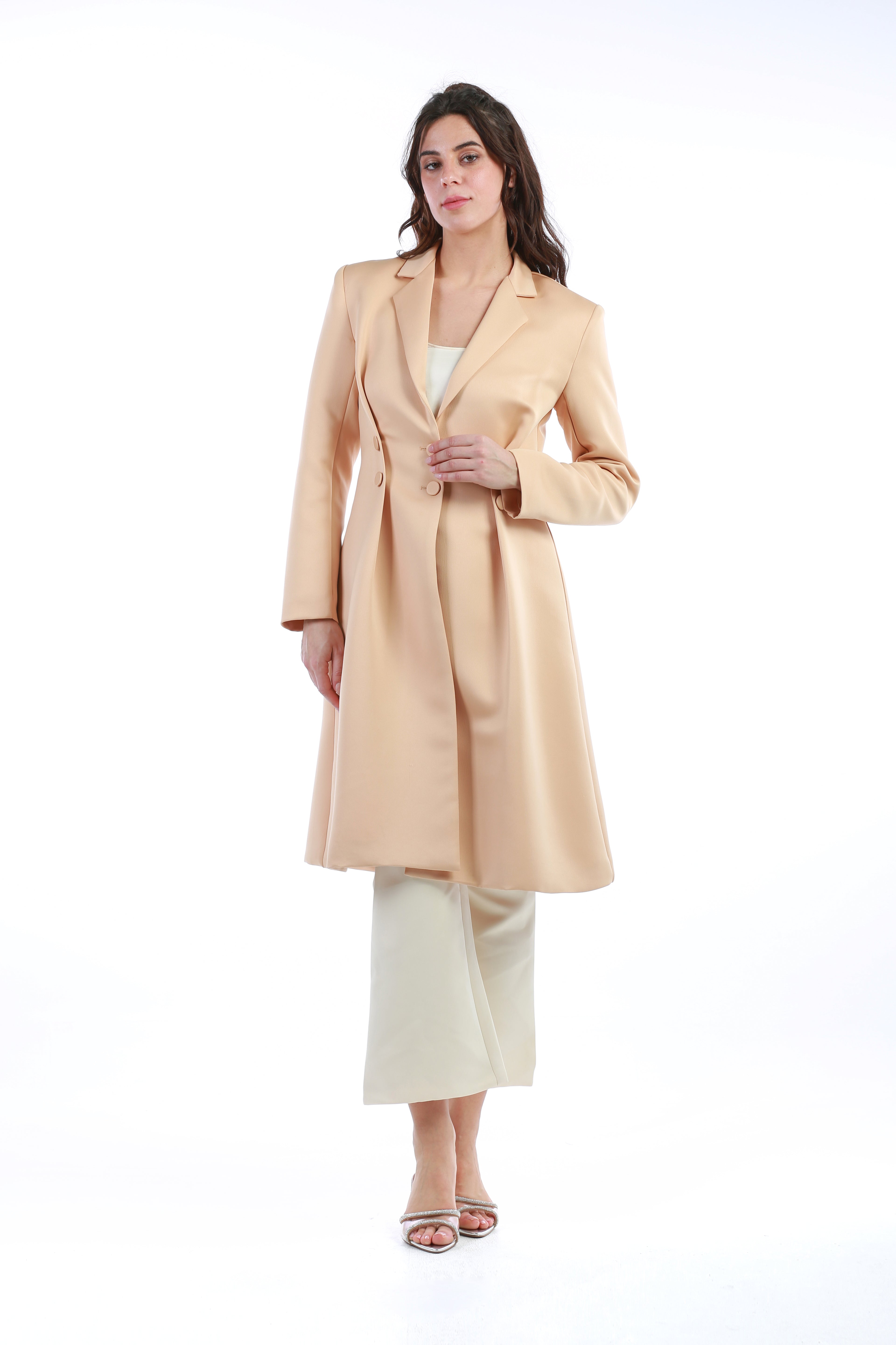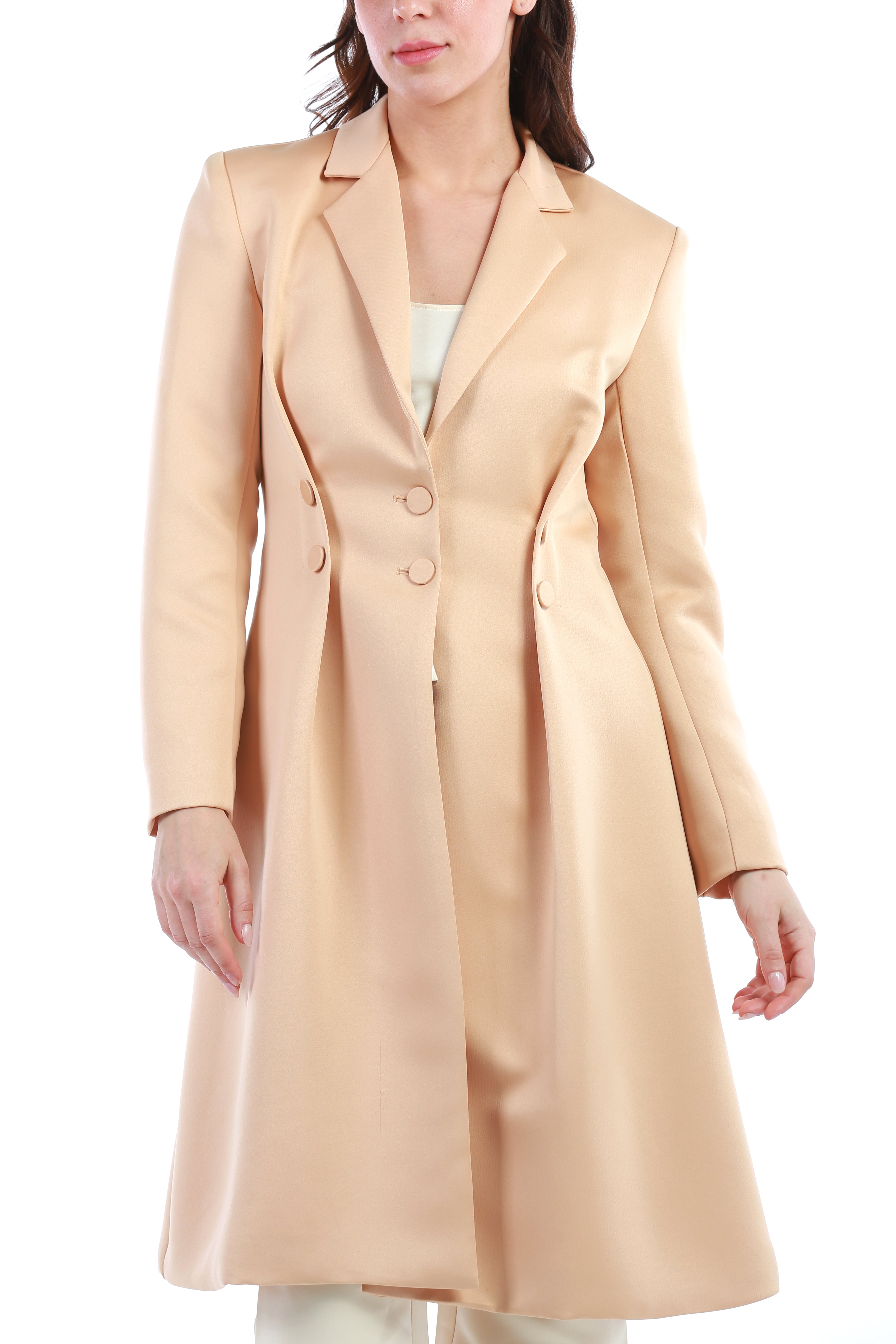Add a refined touch to your wardrobe with this elegant longline blazer jacket. Expertly tailored to enhance your silhouette, it features a classic notched collar, double-breasted button accents, and structured shoulders for a polished look. The smooth finish and subtle sheen make it an ideal choice for both workwear and elevated outings.
