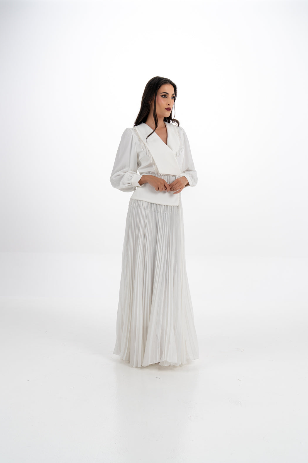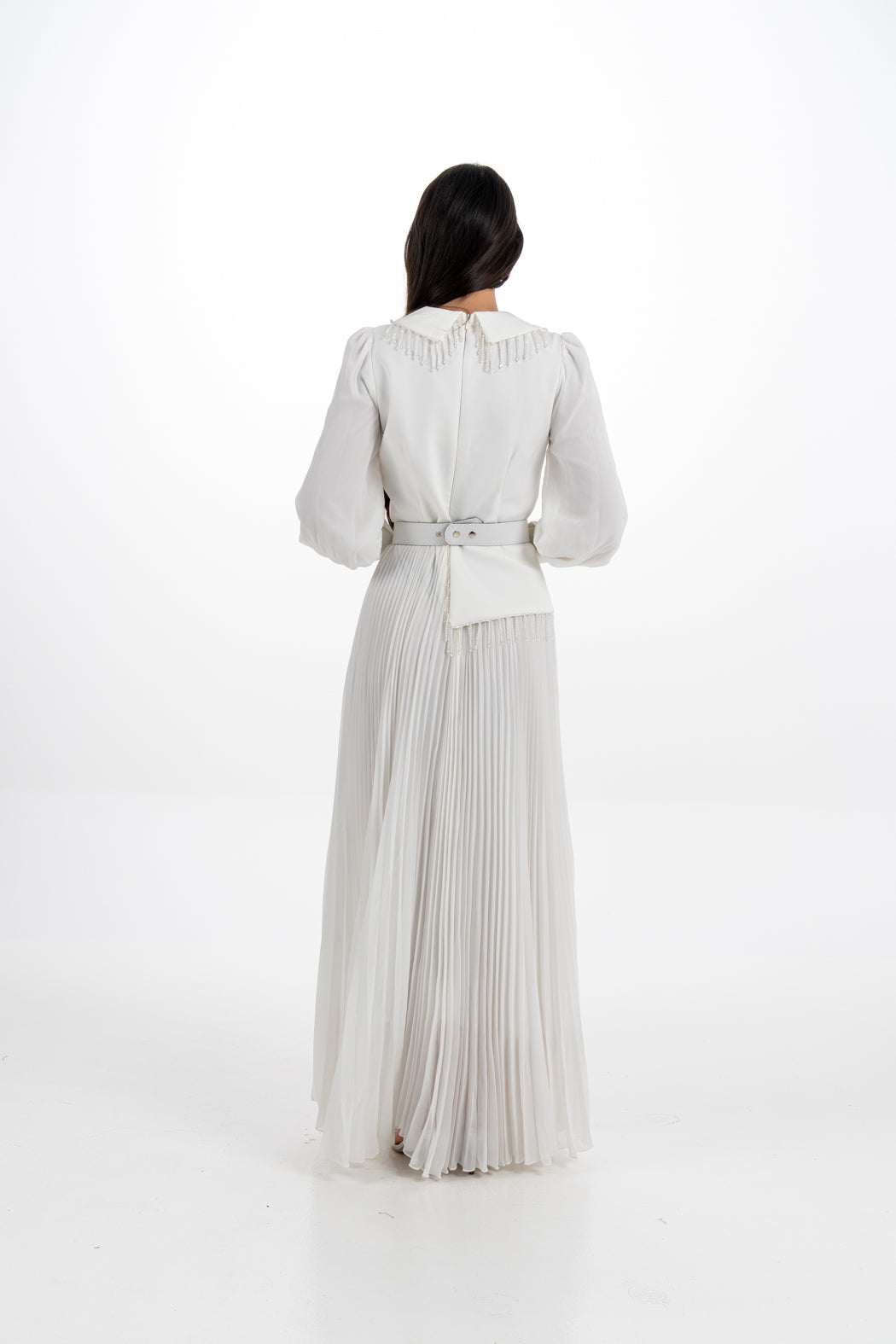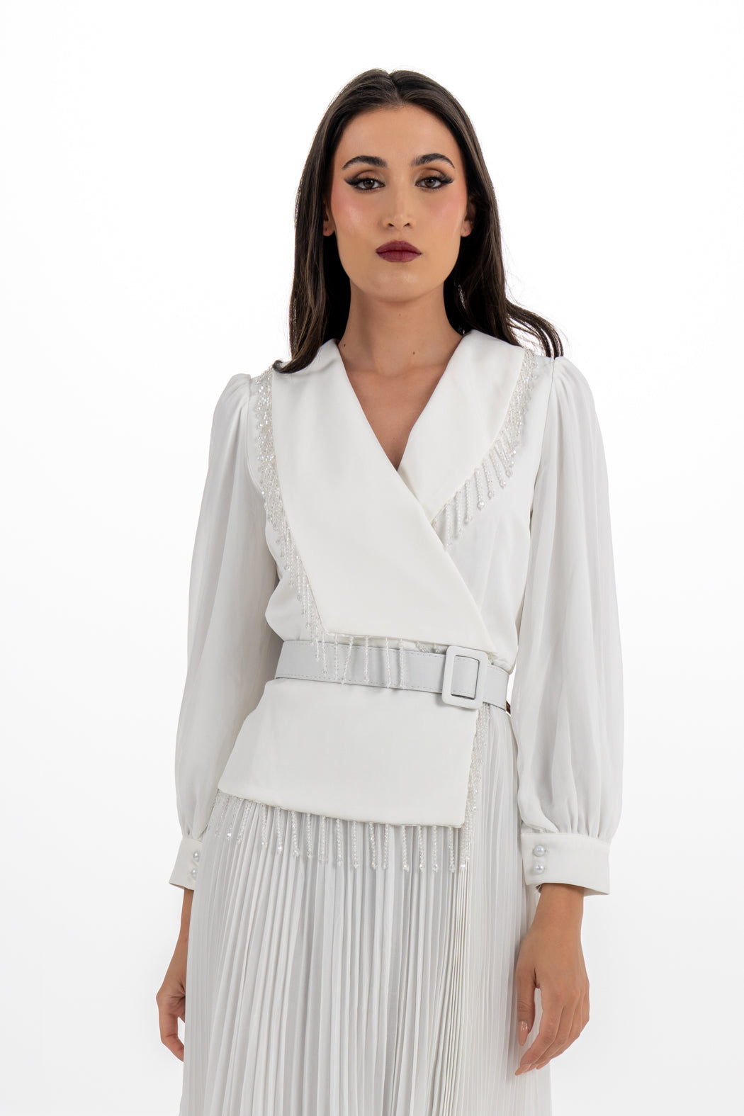 Step into timeless elegance with this beautifully crafted pleated maxi dress, designed to exude sophistication and grace. Featuring a refined wrap-style bodice with a wide lapel collar, this piece is adorned with intricate bead and sequin embellishments that cascade delicately along the shoulders and waistline. The full-length pleated skirt flows effortlessly, offering both movement and charm, while the cinched waist is defined with a sleek, detachable belt pouch for a modern twist.